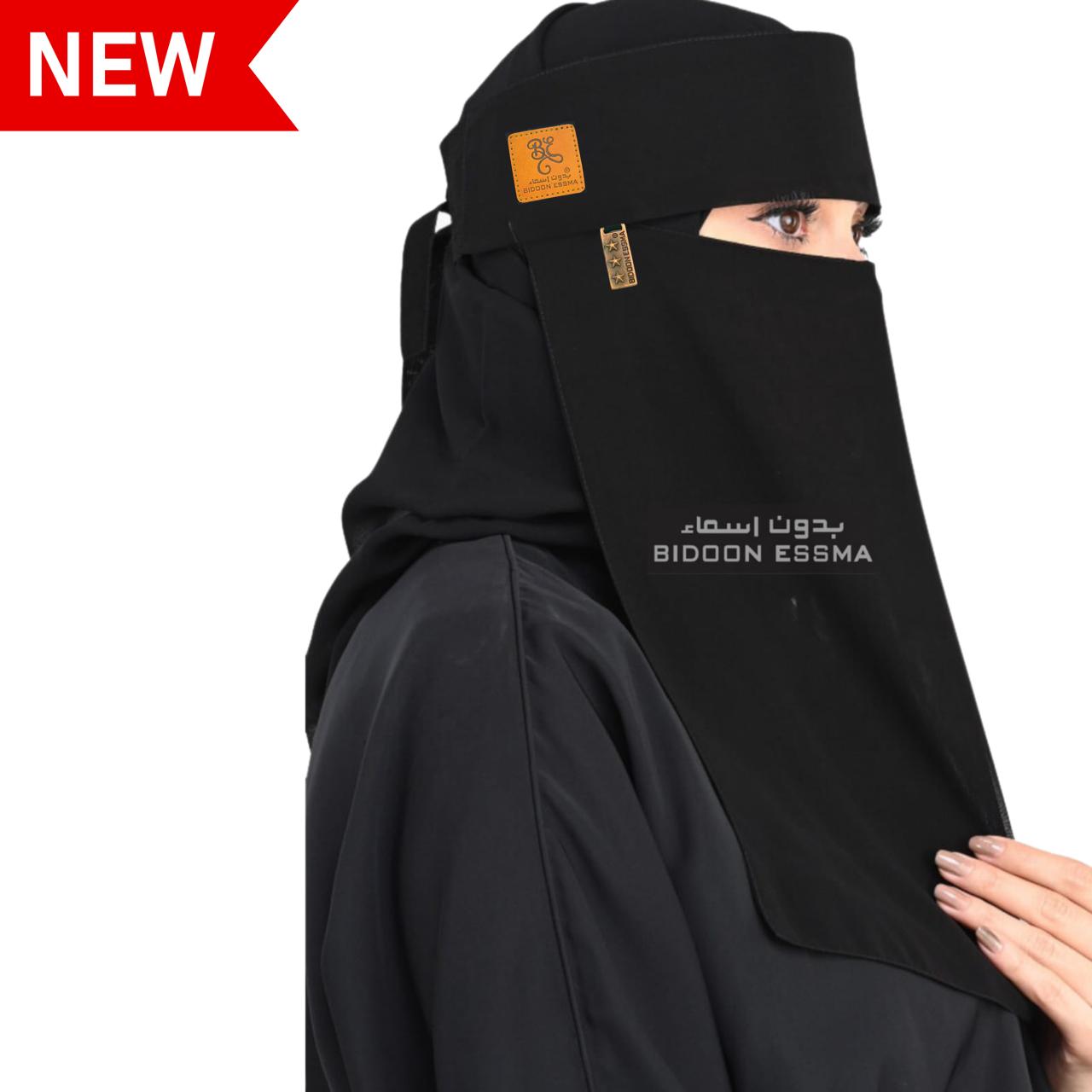 BIDOON ESSMA Premium Saudi Flap Niqab 13X13 - Regular Black with Leather Patch & Metal Logo