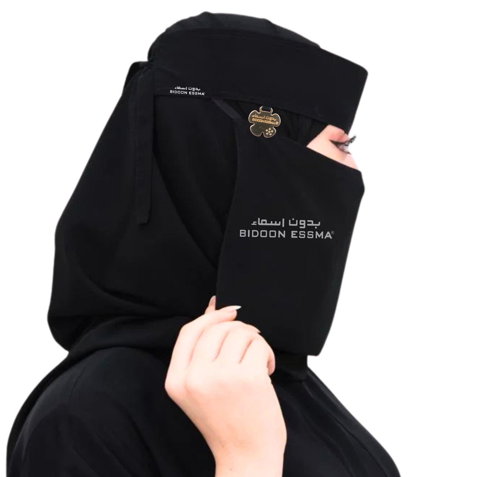 BIDOON ESSMA Premium Saudi Niqab 7X12 - Jet Black with Elegant Metal Logo (Imported Korean Fabric)