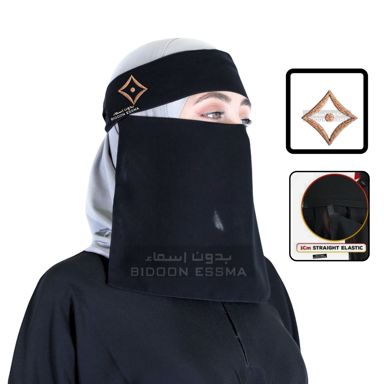 Keywords: Saudi niqab, Louis Vuitton-inspired niqab, designer niqab, golden embroidery niqab, monogram niqab, luxury niqab, modest fashion, Arabic niqab, BIDOON ESSMA niqab, embroidered niqab, high-fashion modest wear.