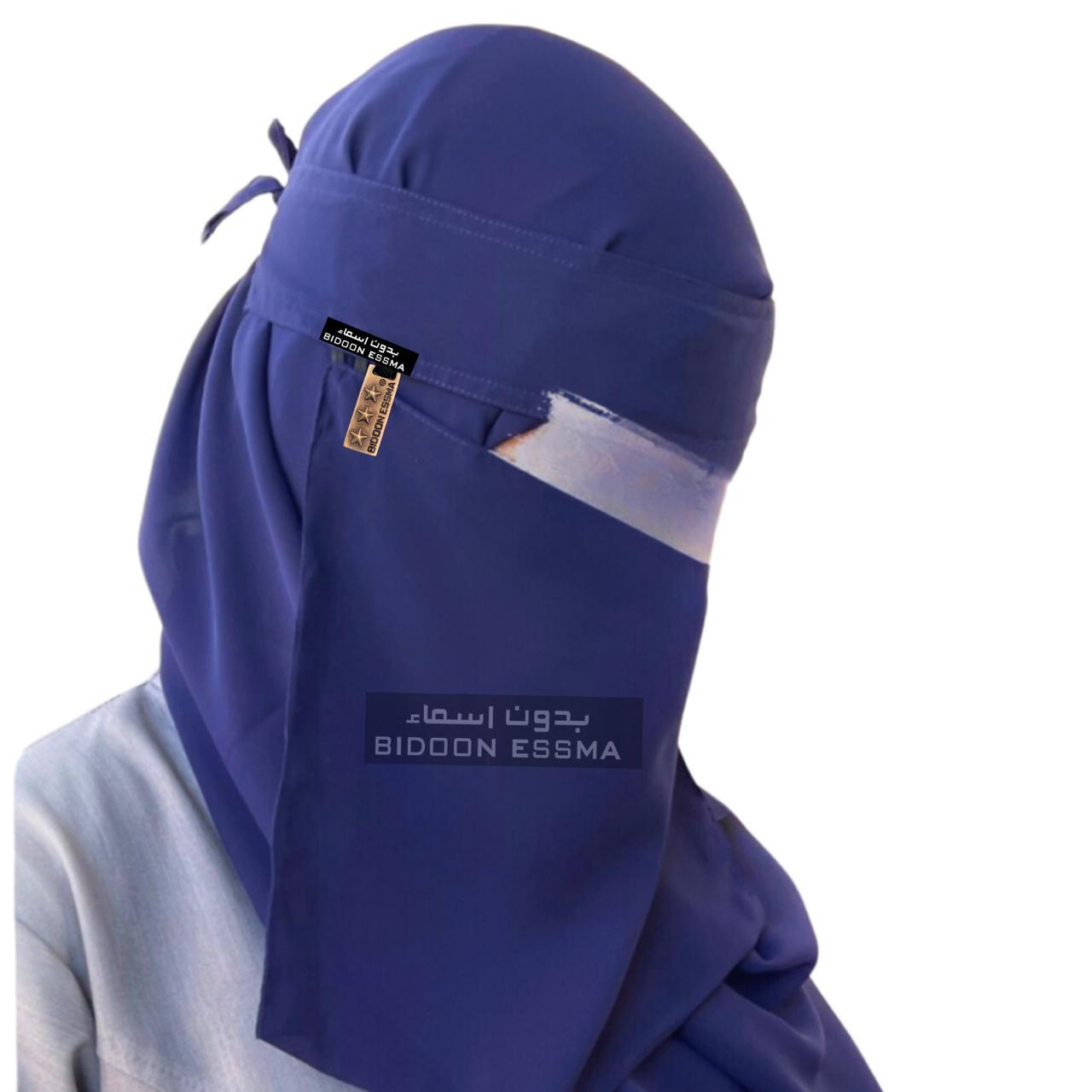 Saudi Niqab, Navy Blue Niqab, Islamic Veil, Muslim Face Cover, Metal Logo Niqab, 10X12 Niqab, Modest Women?s Wear, Breathable Niqab, Elegant Niqab, Traditional Islamic Clothing, Adjustable Niqab, Premium Hijab Accessory.