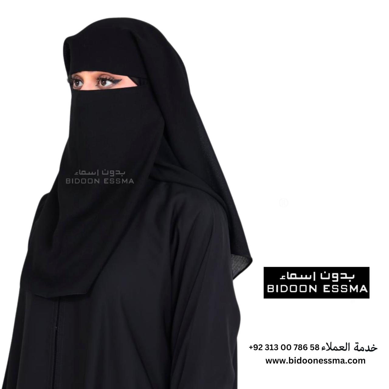 This BIDOON ESSMA Cloché Niqab has two pieces. The covers the front of the face; the second is draped back over the head.