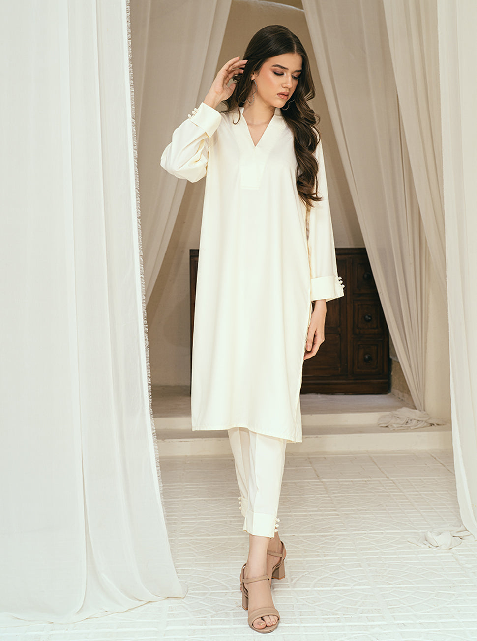 Step into the epitome of sophistication with our women's daily wear ensemble, featuring shirts and bottoms in the timeless hue of "Whispers of Elegance: Women's Wear in Parchment Cream." This collection boasts a touch of artistry with meticulously crafted artistic buttons gracing the sleeves and bottom, adding a unique flair to the ensemble. The subtle yet refined design is tailored for both comfort and style, offering a chic outfit suitable for any occasion. Embrace the understated allure of Parchment Cream, where each piece becomes a canvas for expressing your unique sense of modern fashion.