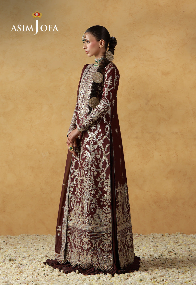 A masterpiece of baroque opulence, where every stitch pays tribute to the grandeur of historic artistry. Set against a deep maroon base, this ensemble is elevated with luminous light gold zari and delicate sequins that create a rich, regal presence. Inspired by the ornate elegance of Rococo design, the detailed neckline flows into a strikingly embroidered border, framing the silhouette like a work of fine art. Paired with a beautifully embroidered dupatta, this ensemble becomes a timeless expression of luxury, grace, and craftsmanship.