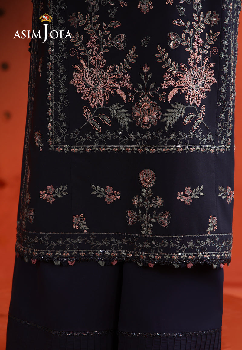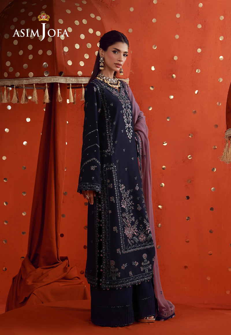 An elegant interplay of depth and softness, this navy blue ensemble redefines understated festivity. The long shirt is intricately embroidered with lilac, navy, mauve, and tea pink threads, elevated by delicate transparent sequins that lend a soft, luminous sheen. The design flows seamlessly into a contrasting mauve dupatta, adorned with minimal embroidery that beautifully balances the richness of the outfit—creating a look that feels effortlessly graceful yet undeniably festive.