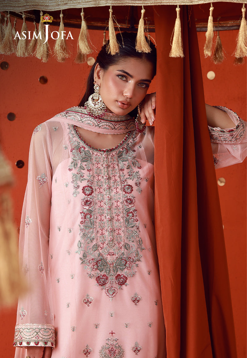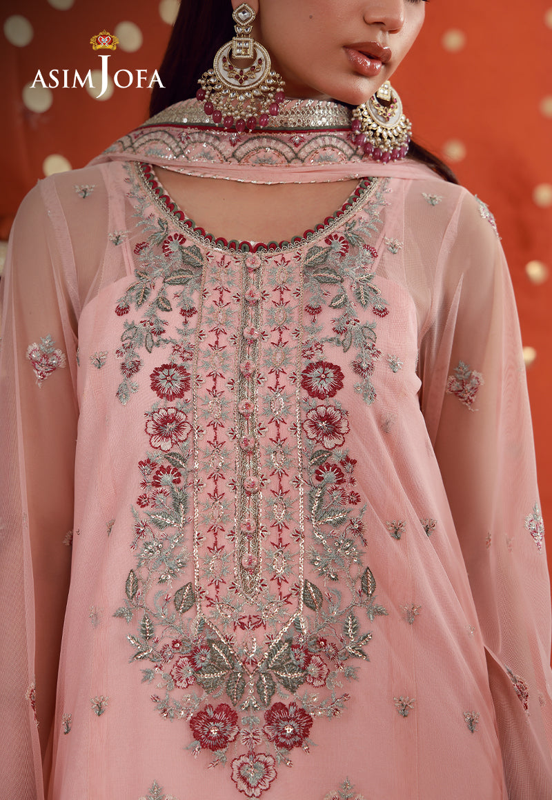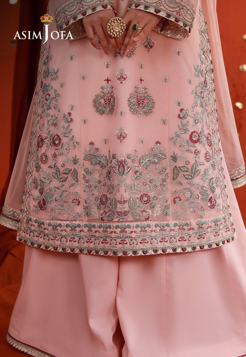Soft yet striking, this peach pink ensemble is an embodiment of refined festivity. The long shirt is adorned with intricate embroidery in magenta and verdant green tones, enriched with copper gold zari and light gold cupped sequins that create a luminous, textured finish. A lavishly detailed neckline draws the eye, while the heavily embroidered borders ground the design with depth and grandeur. Paired with a minimally embroidered dupatta, the ensemble maintains perfect balance—allowing its intricate craftsmanship to shine with quiet confidence.