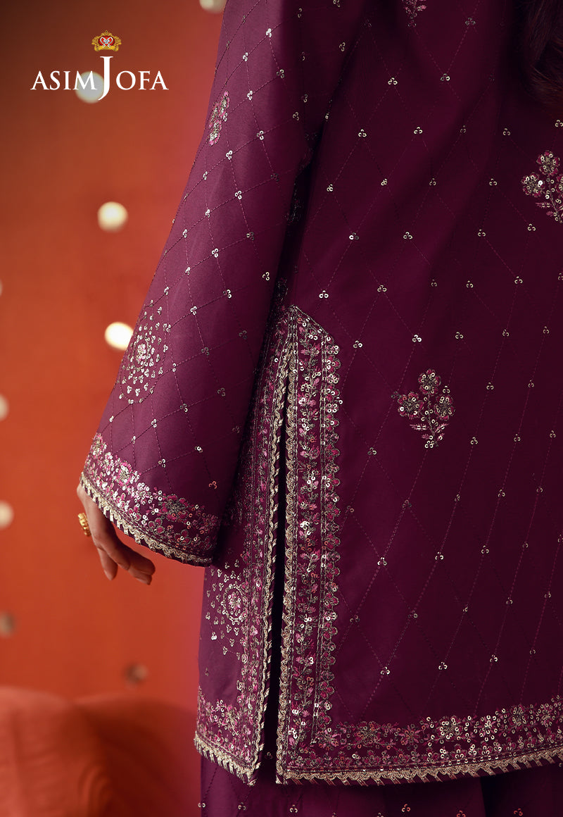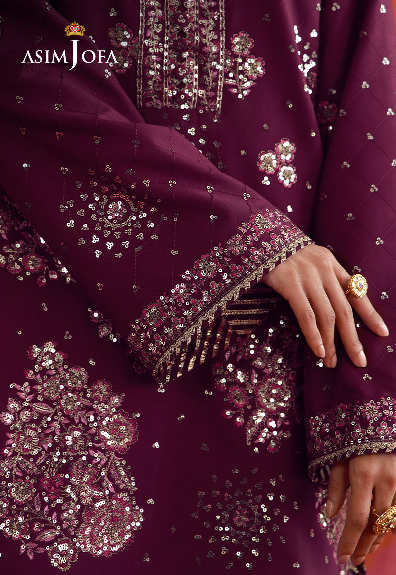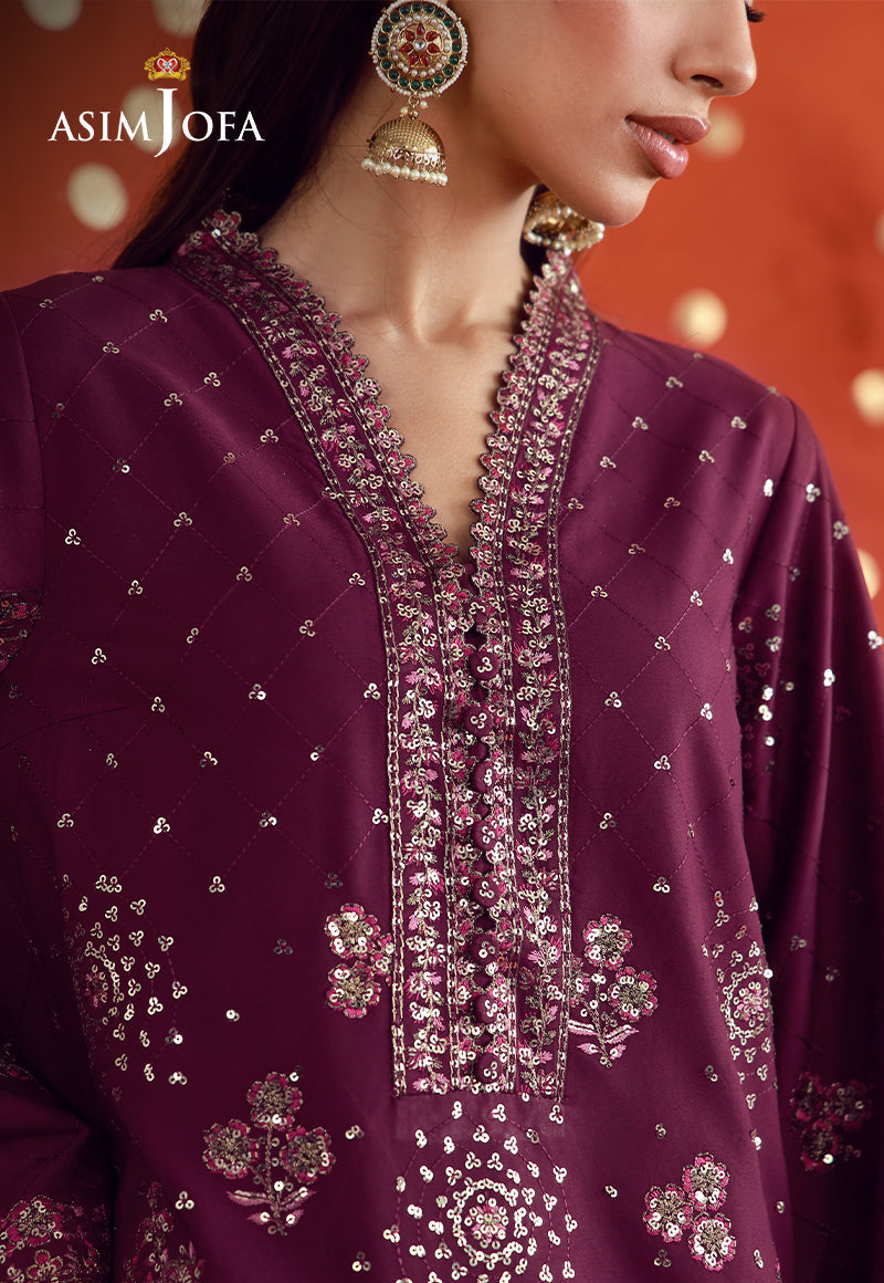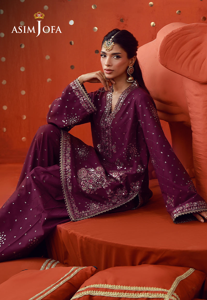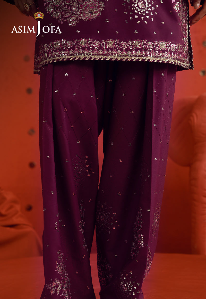 A vibrant expression of celebration, this magenta ensemble captures the essence of joyous occasions with striking finesse. The shirt is richly embroidered with scattered motifs, brought to life through light gold zari and shimmering sequins, intertwined with multihued threadwork that adds depth and vibrancy. Paired with embroidered trousers where sequins catch the light with every step, the ensemble exudes a dynamic festive allure—balancing boldness with graceful sophistication.