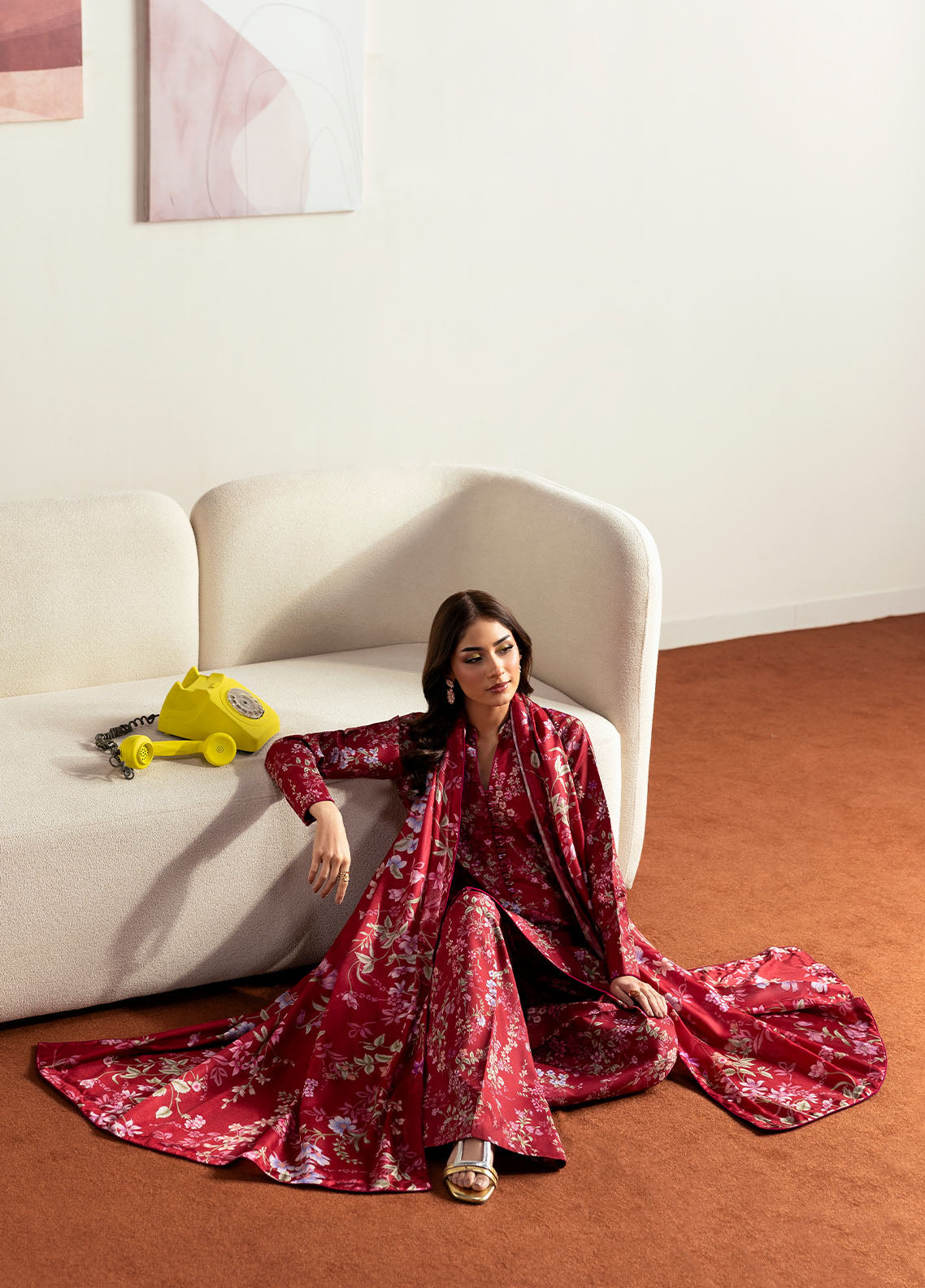 Aster brings a refreshing twist to everyday style with its chic short shirt, paired effortlessly with a flowy bootcut sharara. The shirt features a clean band collar neckline that adds a hint of structure and sophistication. Completed with a vibrant printed silk dupatta, this airy lawn ensemble is perfect for warm days when comfort and effortless elegance go hand in hand.