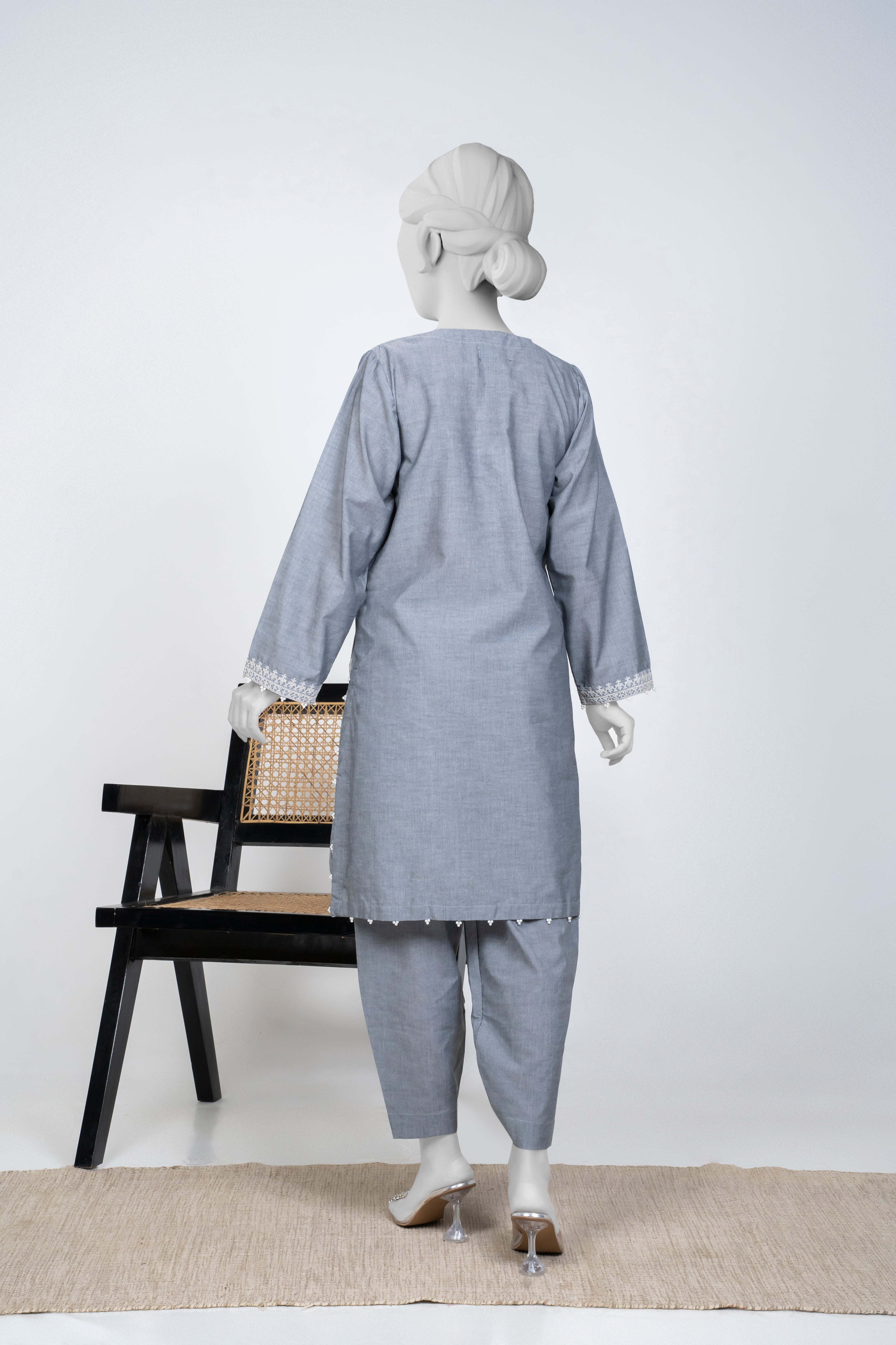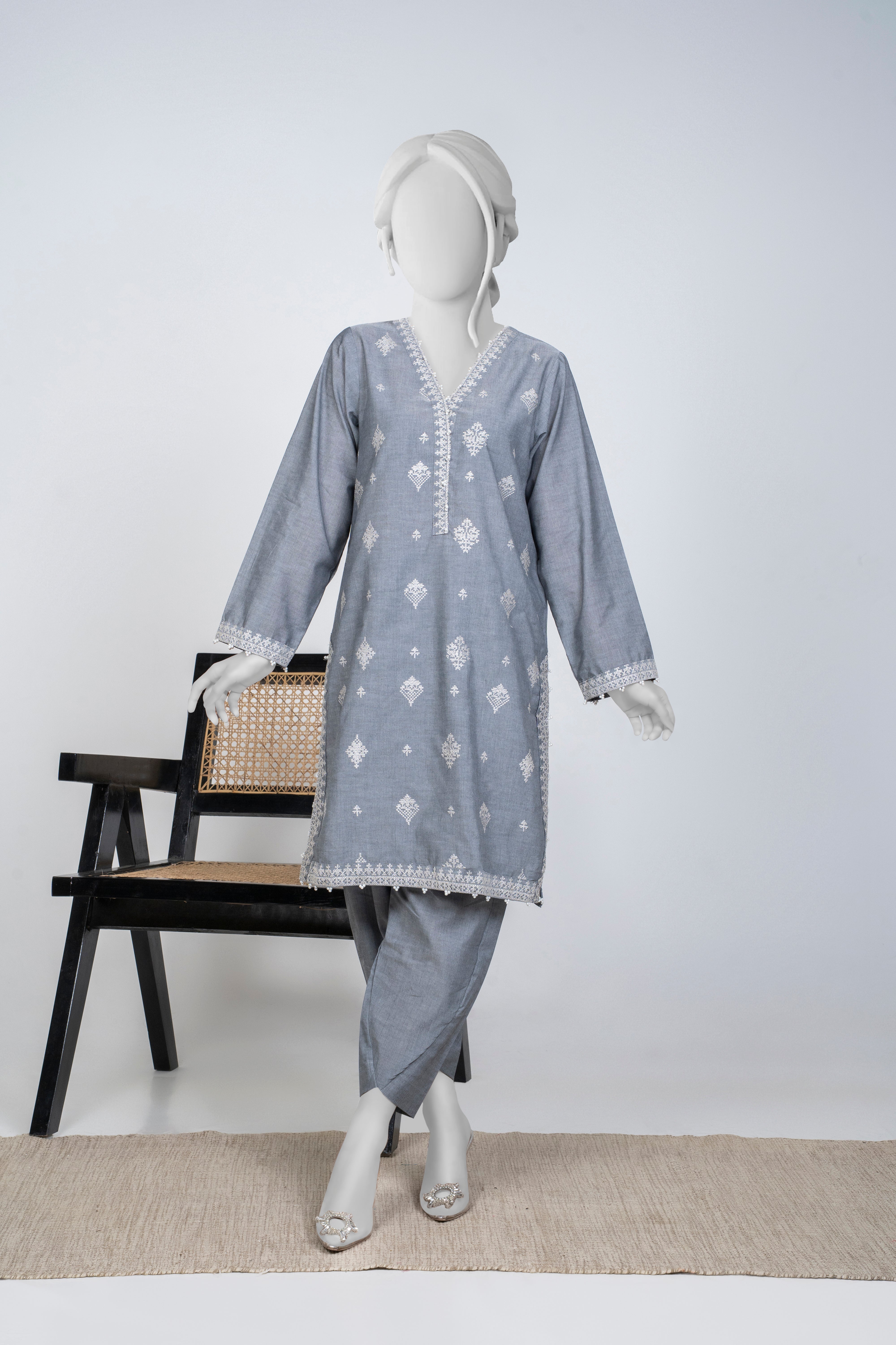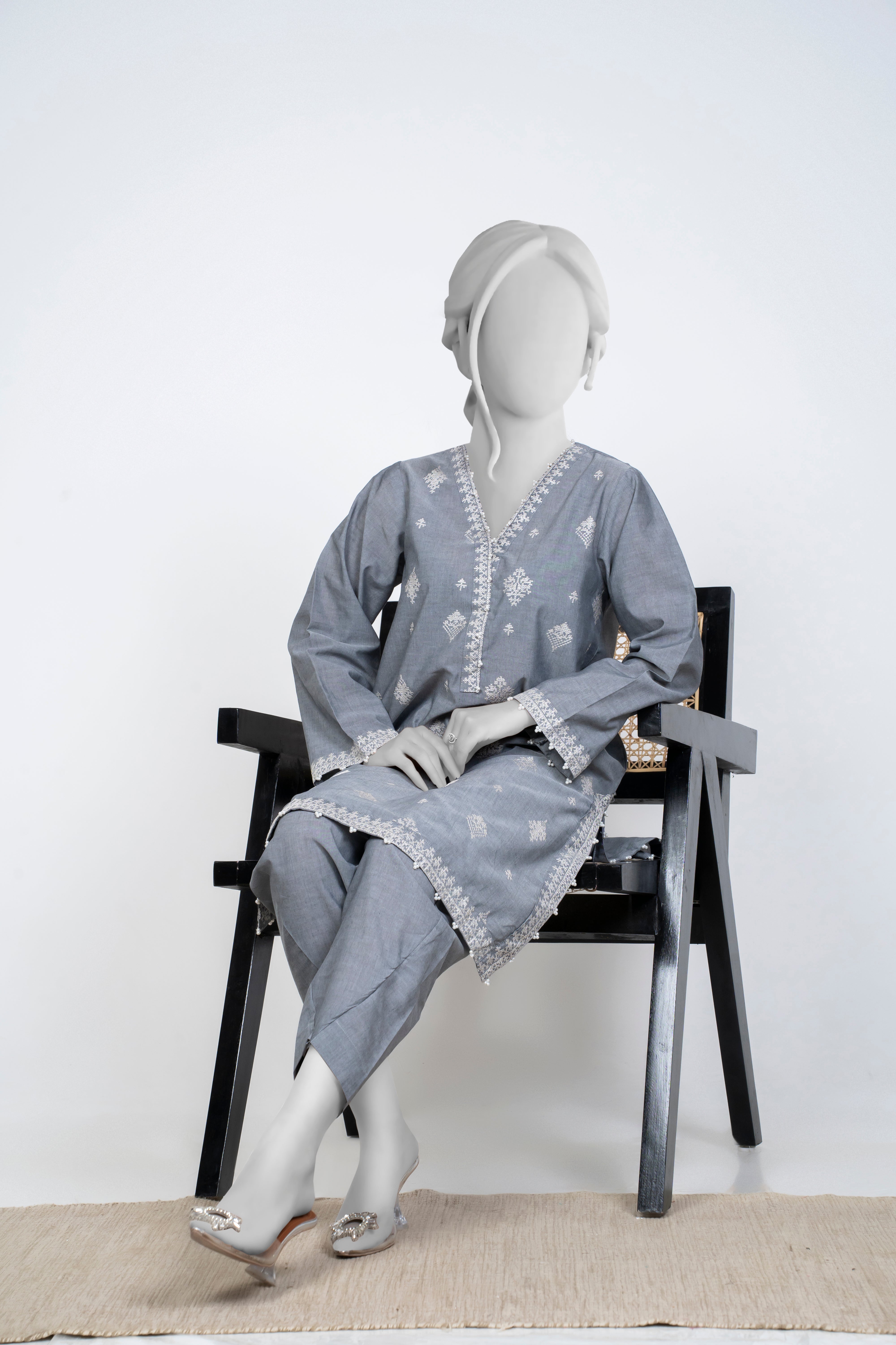 Embrace the Chambray Winters 2025 collection with this elegant Grey 2-piece set featuring solid embroidery that adds refined texture and charm. Paired with tulip-shaped trousers, it offers a fresh and graceful silhouette perfect for stylish winter wear. This ensemble blends comfort and sophistication, making it an ideal choice for those seeking understated elegance with a modern touch.