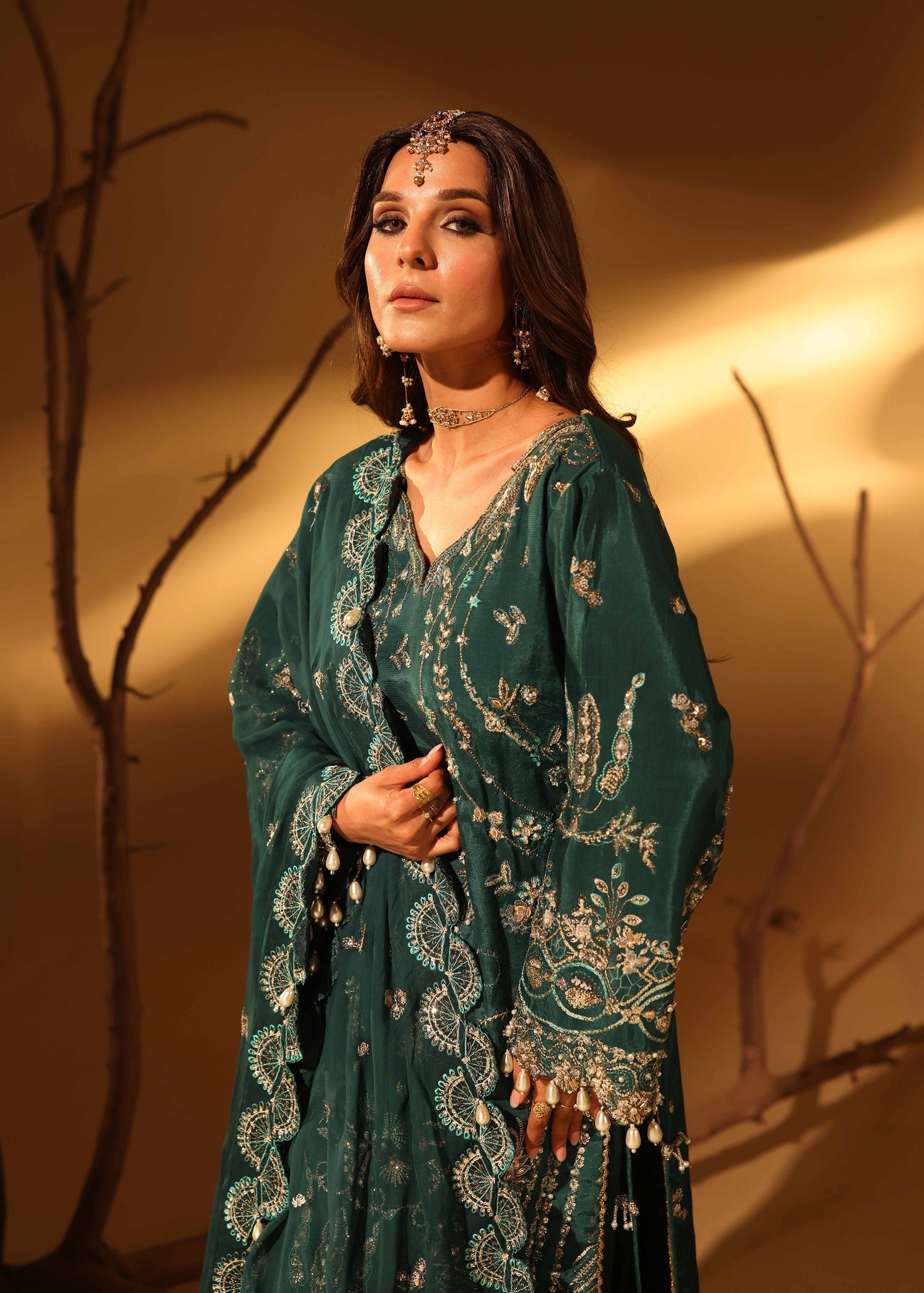 Grounded yet refined, Green Slate embodies understated power through rich green raw silk and meticulous hand embellishment. The centre, side panels, and sleeves are thoughtfully adorned to create a balanced, elongated silhouette, while the embellished front border adds a subtle focal point.
