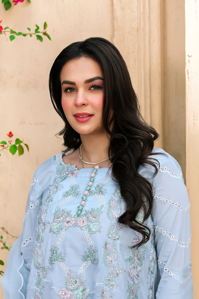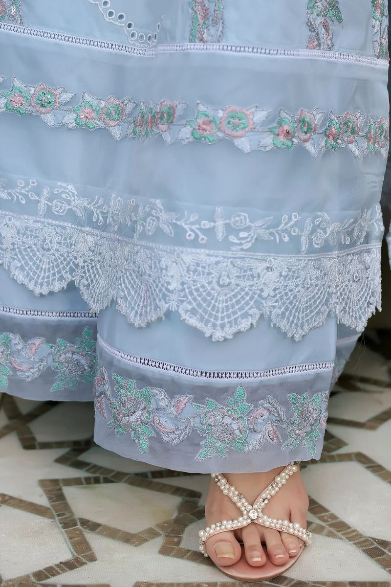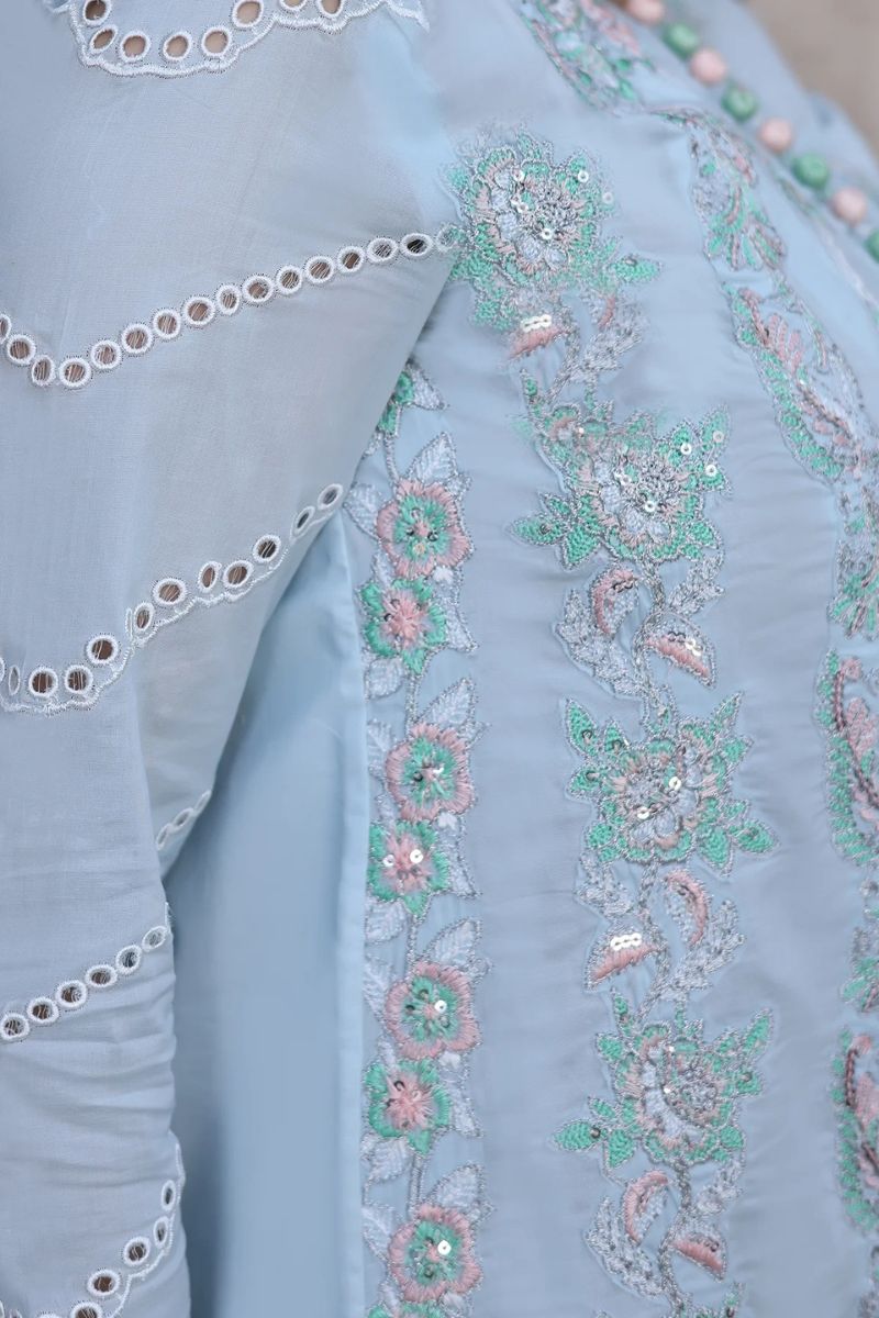 This ice blue ensemble speaks of subtle drama and gentle fluidity. Adorned with delicate embroidery, gleaming sequins, and layered heavy borders, it flows like a breeze?light yet commanding. Each detail whispers a story of softness paired with bold finesse