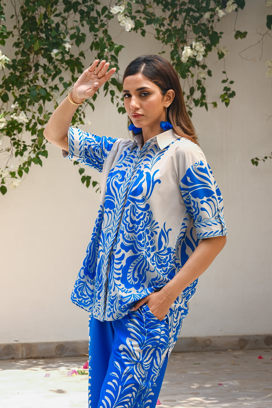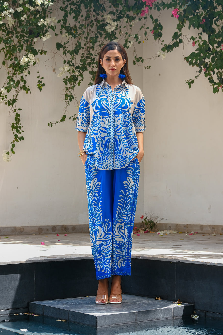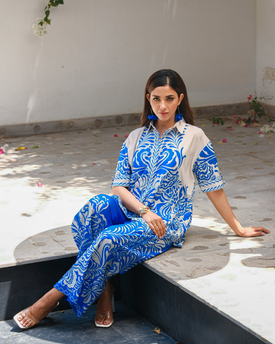 Introducing the ?Bali? summer outfit, crafted from luxurious crepe material in a serene blue and white color scheme. This sophisticated two-piece set features a stylish short-sleeve shirt and matching trousers, designed to capture the essence of relaxed elegance. The lightweight crepe fabric drapes beautifully, providing both comfort and a flattering silhouette. Ideal for beachside strolls or summer gatherings, the ?Bali? ensemble effortlessly combines chic simplicity with a touch of tropical charm. Embrace effortless style and cool sophistication with this versatile outfit, perfect for making a statement during the sunny season. Discover summer elegance with the ?Bali? set.