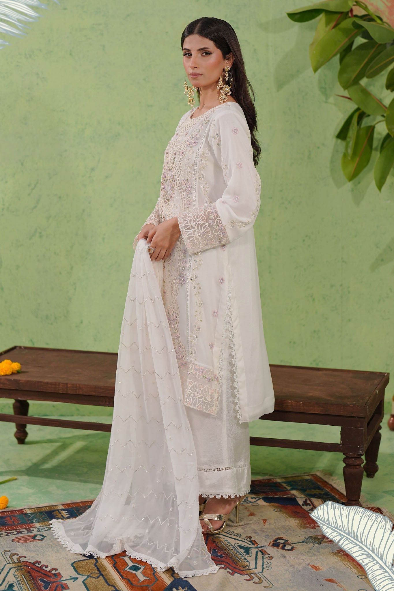 A beautifully embroidered chiffon dupatta, enhanced with refined lacework, offering a graceful and ethereal appeal.