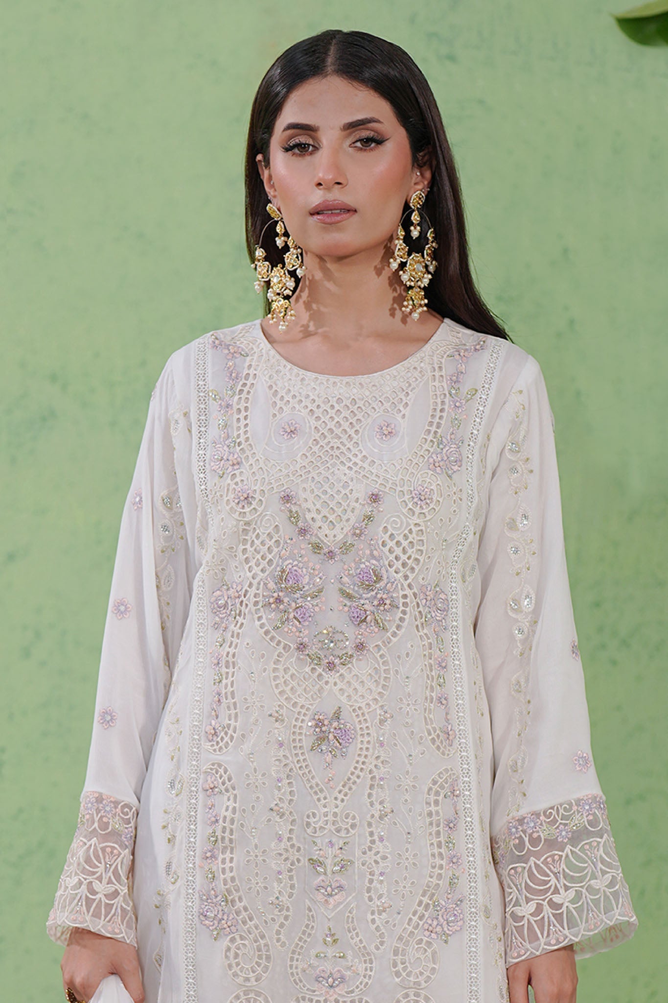 Elegant chiffon shirt featuring intricate embroidery, delicate handwork, and graceful lacework. The front center panel is adorned with full boring/cutwork, layered over a soft and comfortable viscose inner.
