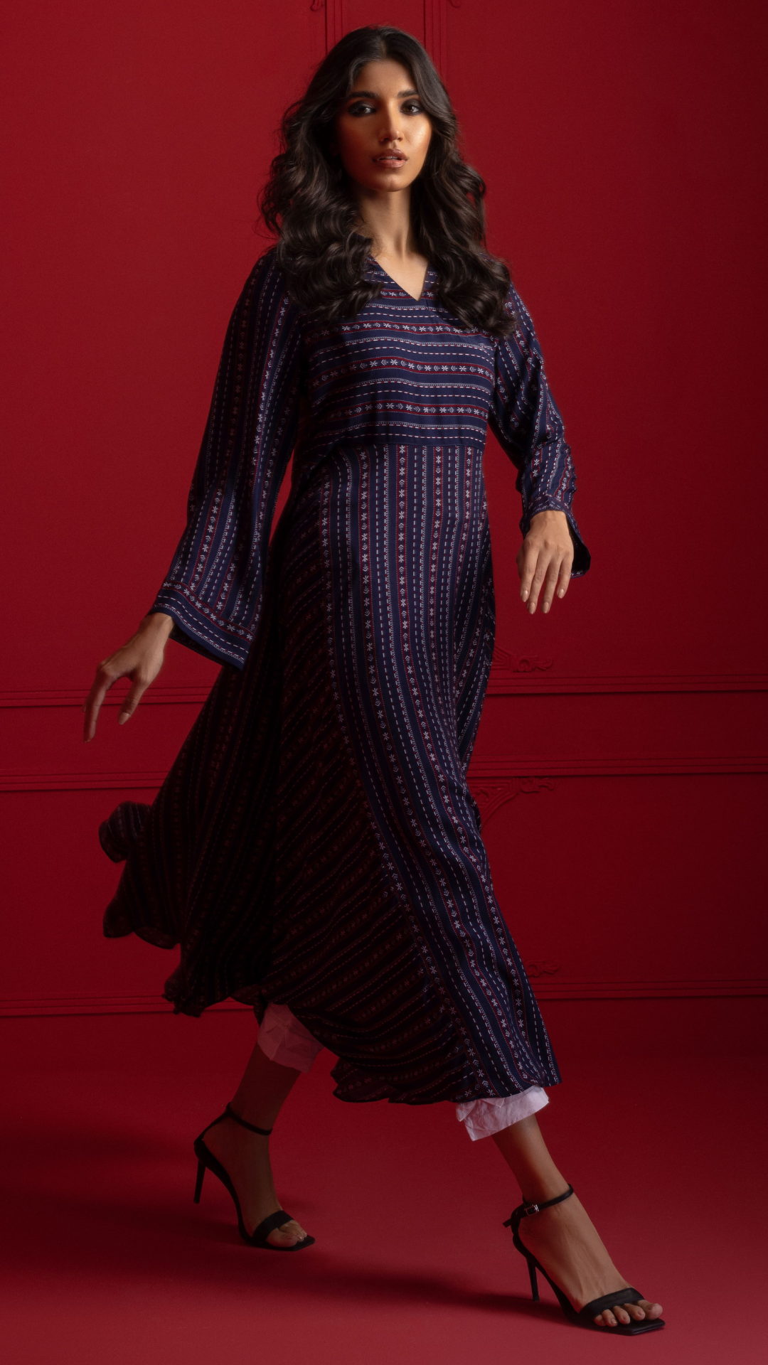 This exquisite dress boasts an extravagant volume of high-quality boski linen fabric, masterfully paneled to create a stunning, flowing drape. The innovative use of a Navy blue stripy print, strategically applied in vertical, horizontal, and diagonal orientations, adds depth and dimension to the ensemble, making this dress a striking statement piece of wearable art. To complete the look, the outfit is adorned with maroon beads and shell tassels, adding a touch of exquisite detail to this already extraordinary piece.