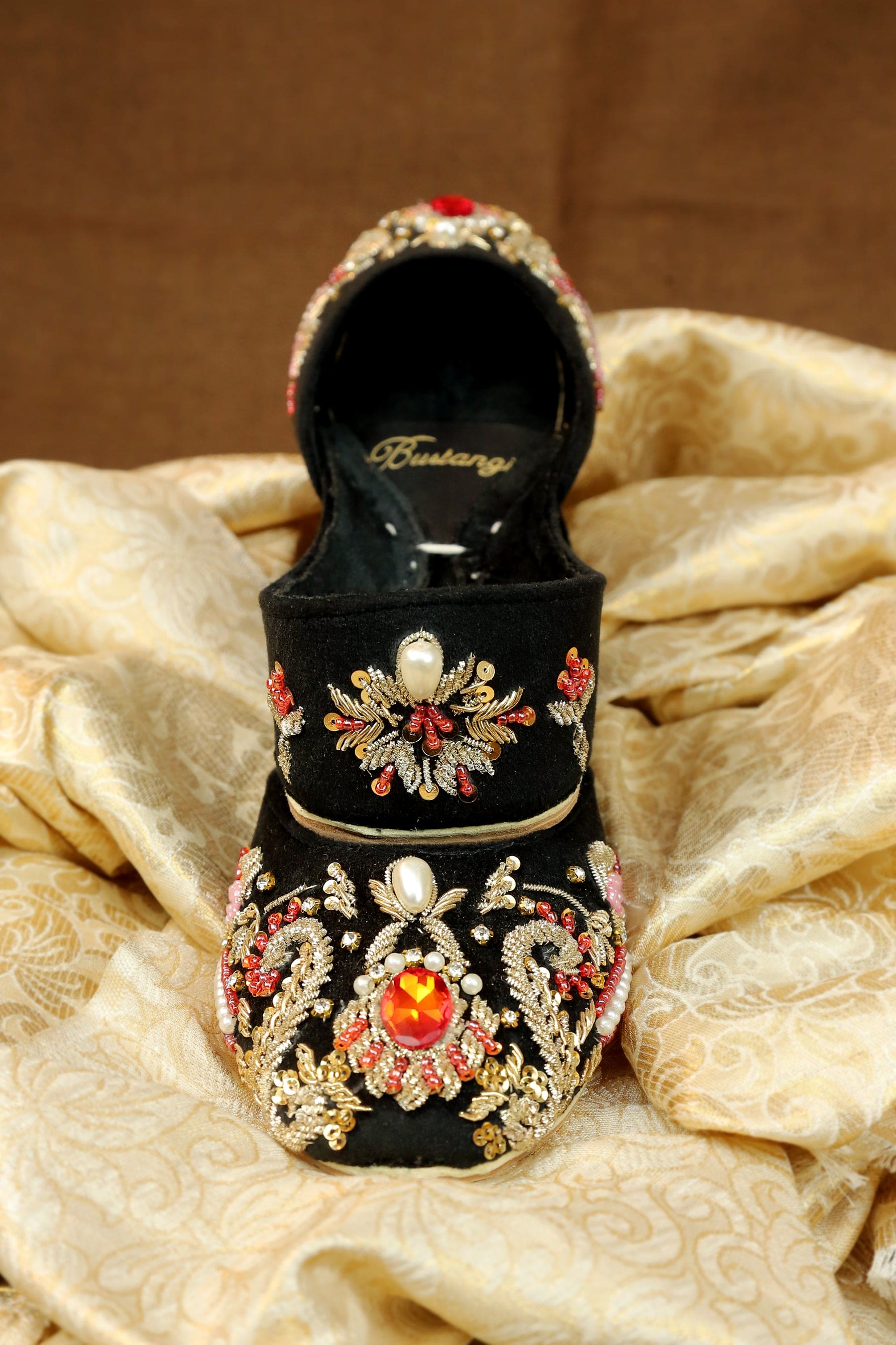 Rich hand embroidery work is crafted on a black velvet base. Made by finest artisans with pearls, dabka and beads. It is durable with leather sole. Double padding is used for additional comfort. This Ladies khussa has necklines to avoid bristles.