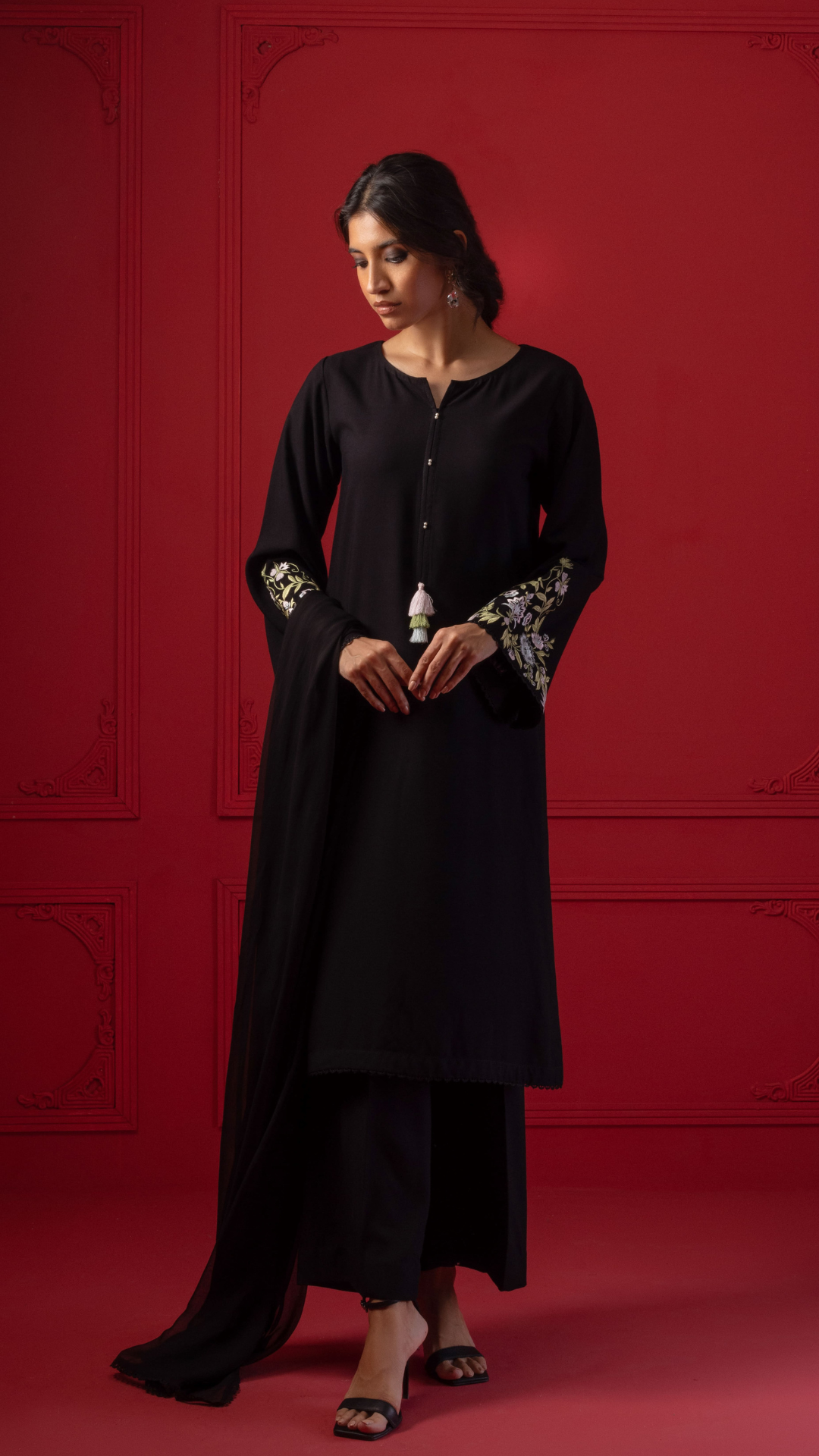 This 2-piece black outfit exudes timeless elegance with modern detailing. The slightly bell-shaped sleeves add a touch of sophistication, while delicate floral embroidery in pastel hues graces the sleeves, providing a subtle yet striking contrast against the black fabric. The neckline is adorned with intricate pearl and tassel details, imparting a touch of opulence to the ensemble. Further enhancing the ensemble are lace trims on the sleeves and daman, adding a delicate and feminine touch. Coordinated loose-fitting pants complete this ensemble, ensuring both style and comfort. This outfit is a perfect choice for those seeking a blend of classic and contemporary style for any special occasion.