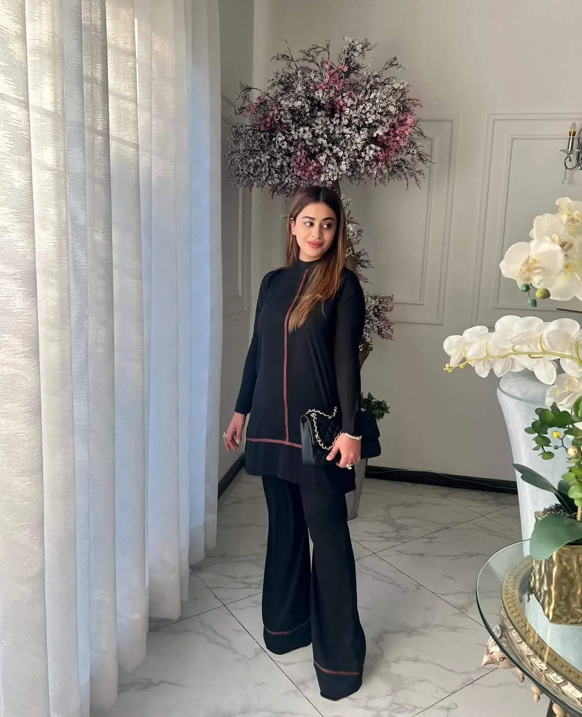 Our black Co-ord set with stripes on it. best for daily and casual wear. High quality fabric.