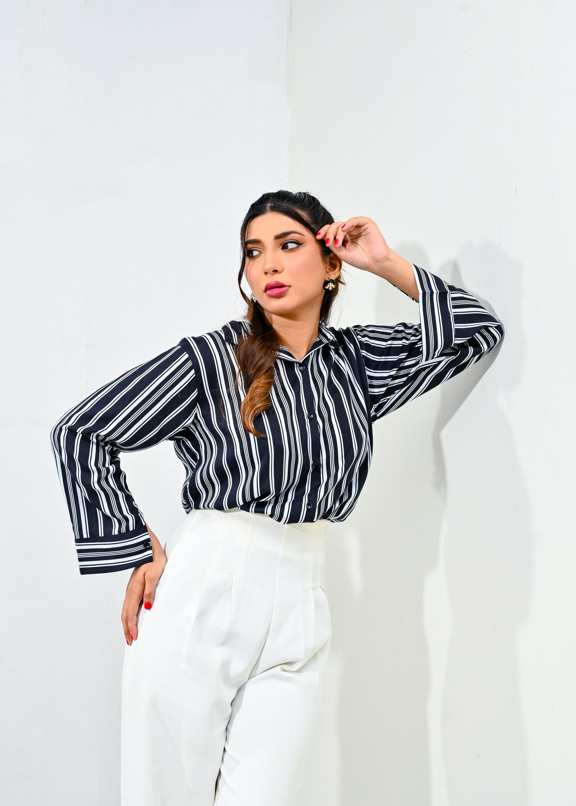 Make a bold statement with this striking linen black top with white lines. The lightweight fabric ensures comfort, while the tailored fit enhances your silhouette. Style it with high-waisted jeans or a chic skirt for a eye-catching ensemble that blends contemporary flair with timeless charm.