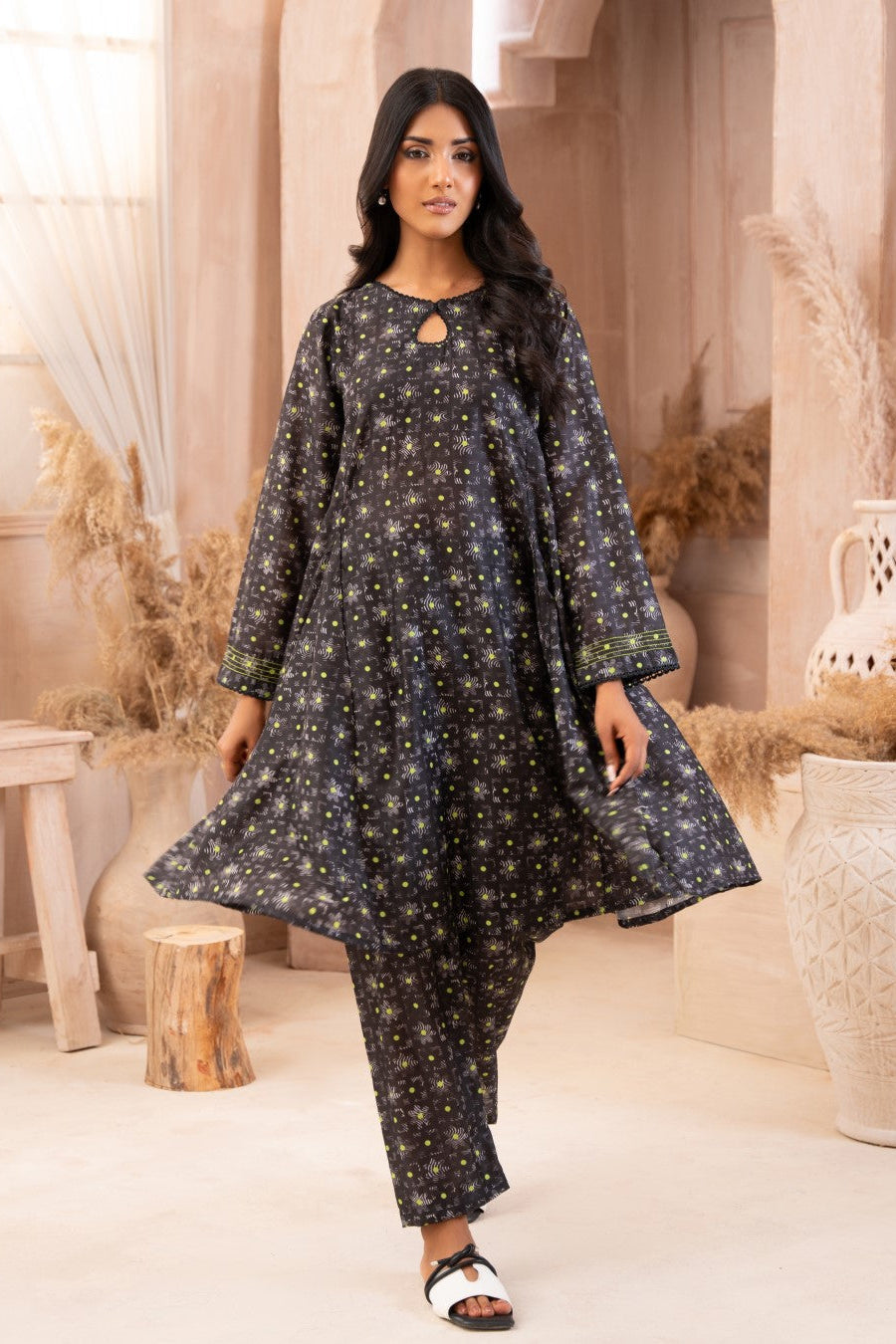 Blooming Fluorescents digital print frock has a unique style fused with panels, a drop neckline and straight pants.