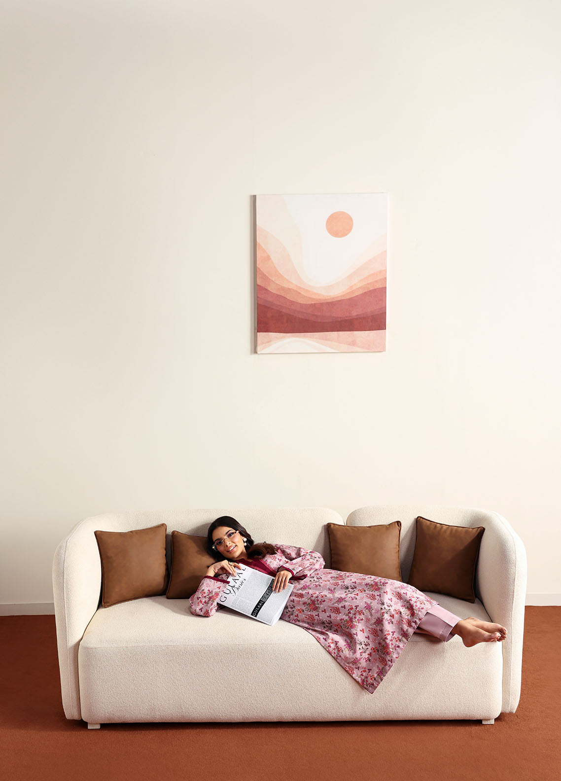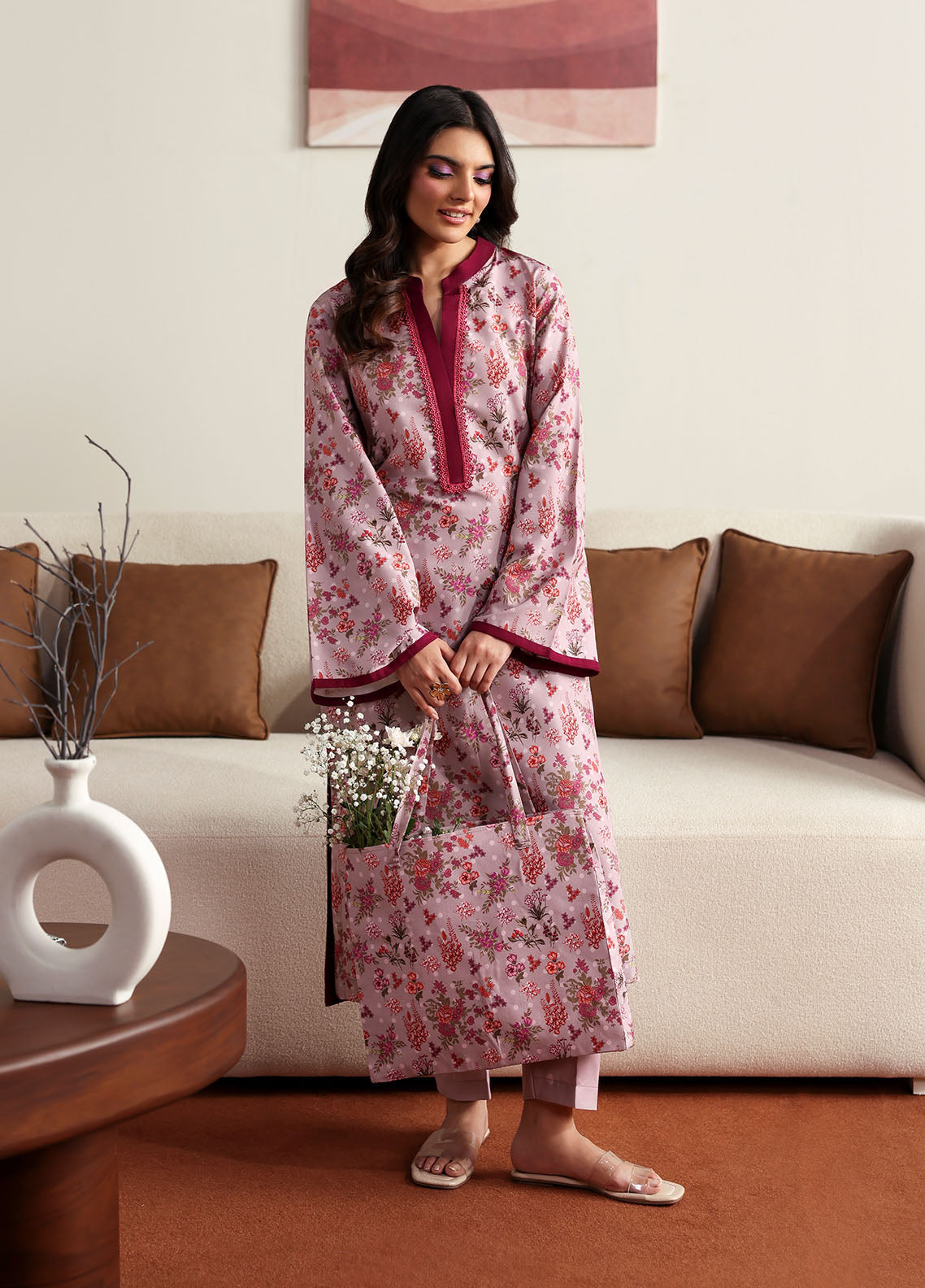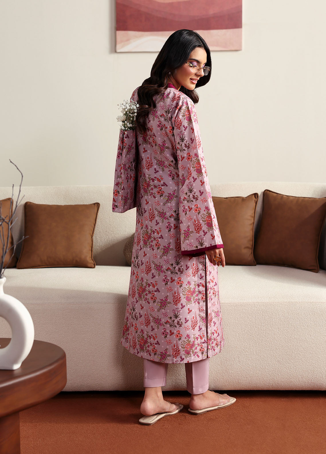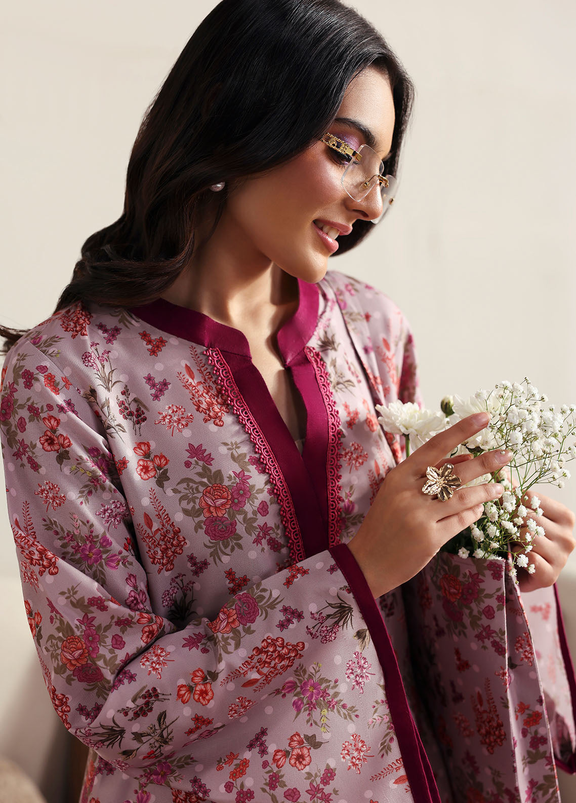 Blossom captures the essence of soft femininity with its serene pale lilac base, brought to life through an all-over floral print. The sleeves are finished with a striking dark magenta trim, adding a subtle yet eye-catching contrast. Paired with a playful printed trouser featuring delicate polka dots, this ensemble blends charm and comfort in the most effortless way.