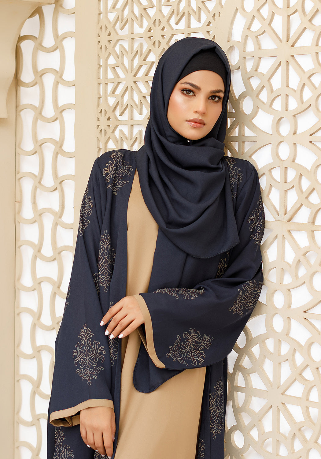 Introducing our exquisite Royal Blue Double-Layered Abaya, which features intricate block print motifs on our upper coat tailored from a soft georgette fabric, that is complemented with a warm caramel attached inner layer made from malai fabric creating a striking contrast. Our elegant abaya makes a statement where ever you go. With a matching Royal blue hijab.