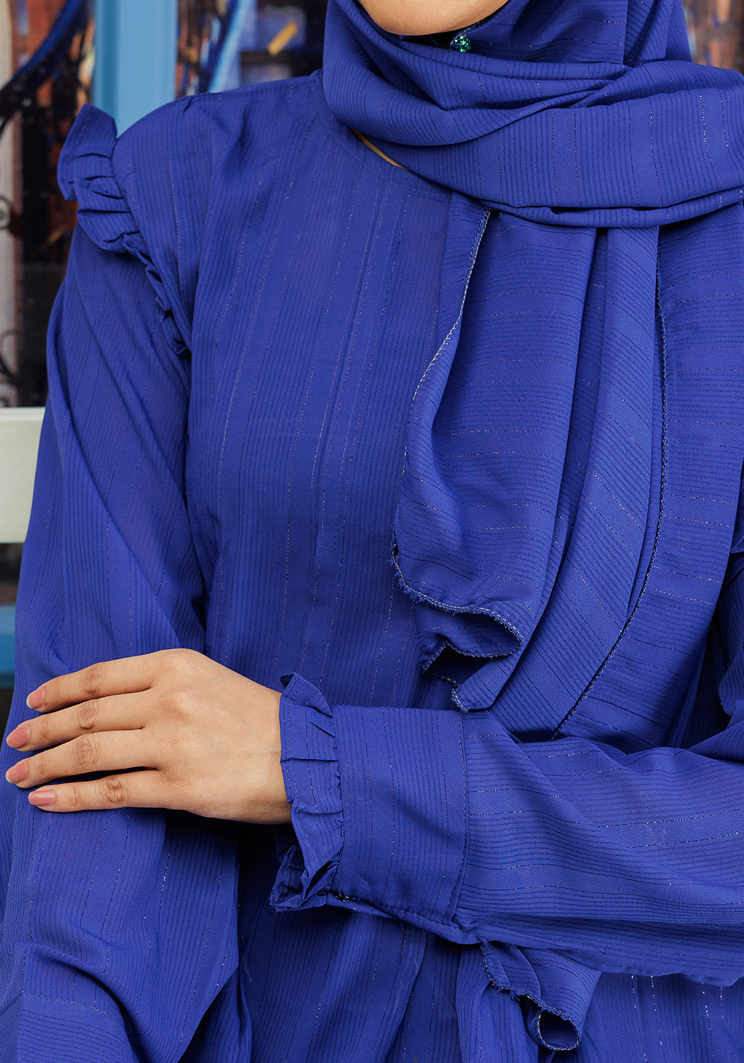 This elegant royal blue outfit features subtle textured stripes, shimmering details, and delicate ruffle accents on the sleeves and shoulders. Perfect for both casual and formal occasions, it combines sophistication with comfort for effortless style.