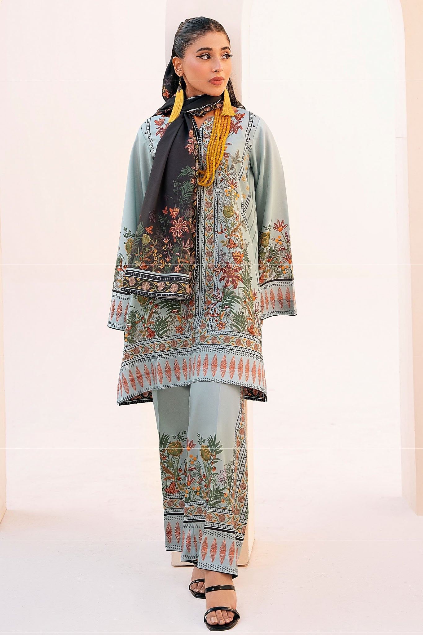 A soft ice blue short shirt ensemble with beautiful print details. The silk set comes with a complimentary scarf and is perfect for the season.