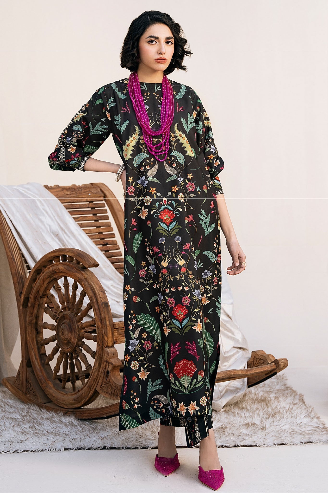 A bold black silk set with bishop sleeves and a vibrant floral print along the shirt and trousers. This beautiful set comes with a complimentary scarf to finish off your look.