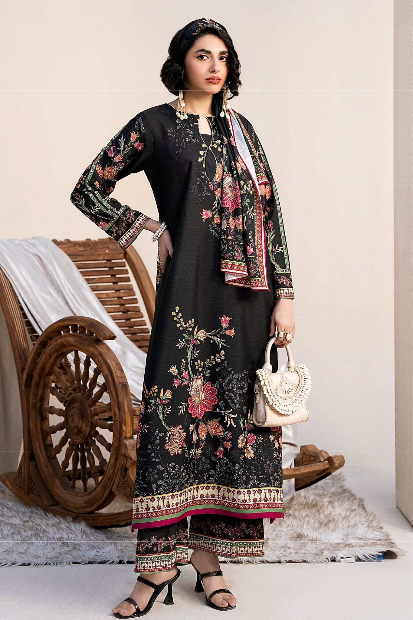 A gorgeous work of art, this black with bold hues printed silk set is a must have and comes with a complimentary scarf to add that bit of sophistication.