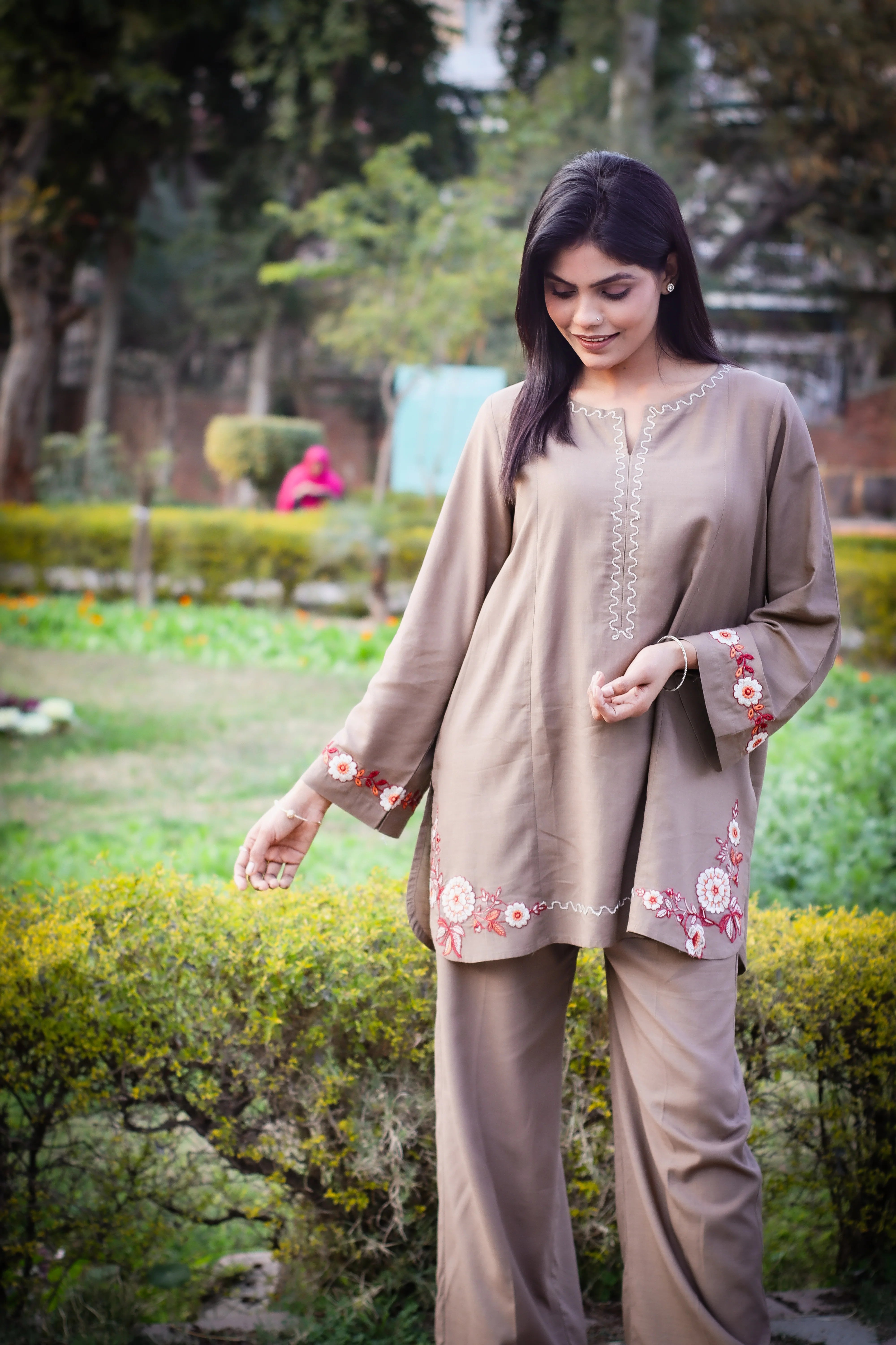Upgrade your everyday style with this elegant brown embroidered cotton co-ord set. Crafted from breathable pure cotton, this two-piece outfit features delicate floral embroidery on the kurta and matching wide-leg Trouser for a comfortable yet sophisticated look. Perfect for casual outings, office wear, and semi-formal gatherings.