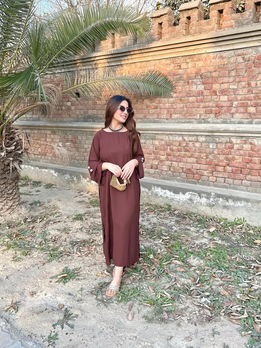 Introducing our premium brown shade shirt with embroidered neck a contemporary classic for the modern wardrobe. Immerse yourself in elegance with the unique hanging neck design with pearls on sleeves, adding a touch of sophistication to your style. Crafted from high-quality fabric, this shirt ensures comfort without compromising on style. The rich dark pink color complements various outfits, making it a versatile choice for any occasion. Elevate your fashion statement with this refined piece, showcasing the perfect blend of trend and timeless appeal.