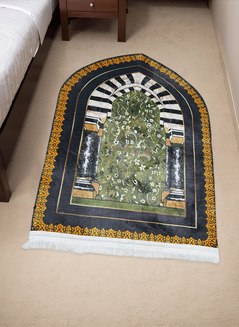 Introducing the revolutionary 3D Jai Namaz - Legend Gold This prayer mat beautifully combines the elegance of traditional Islamic art with modern 3D design elements. Featuring a stunning archway design inspired by the architecture of Masjid Al-Aqsa, it offers a visually captivating 3D effect with a green floral center, bold black & white columns, and a rich gold ornamental border.