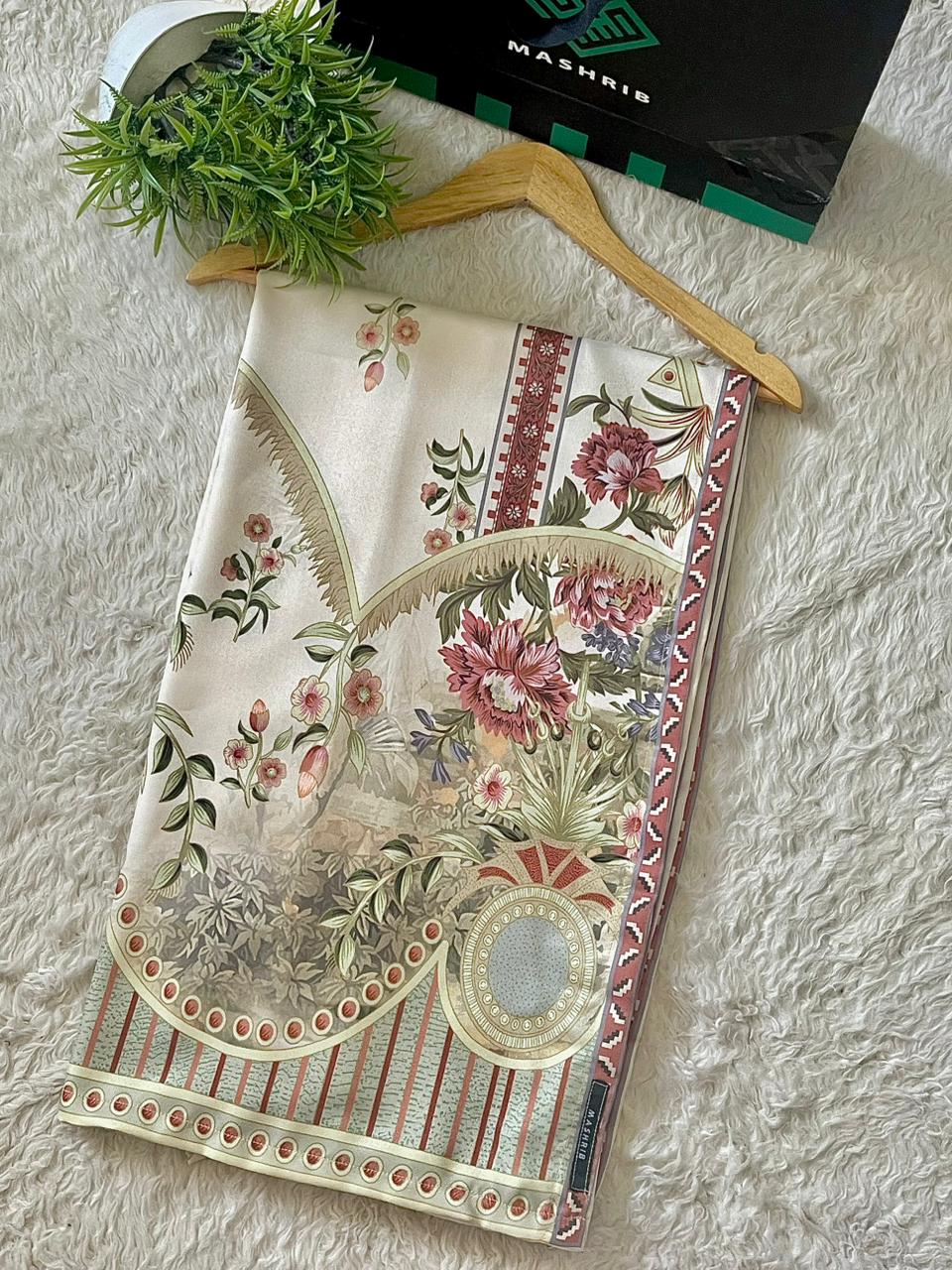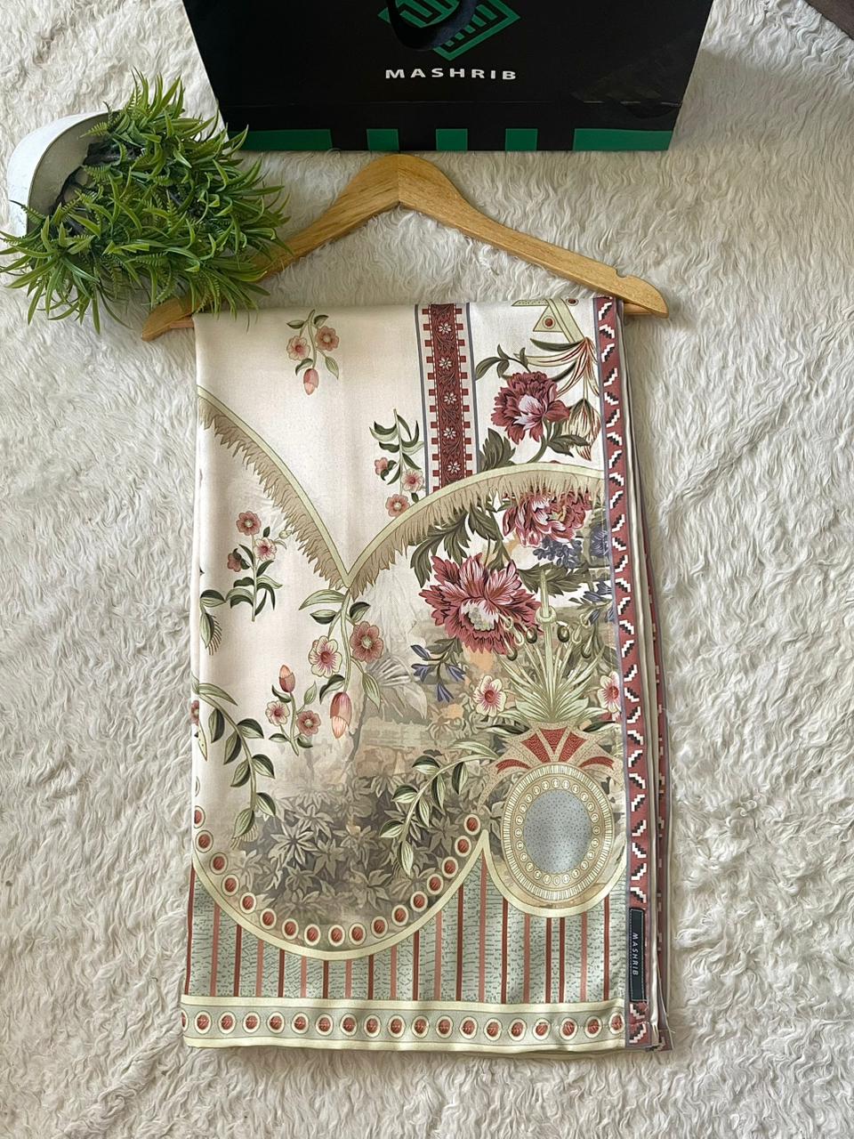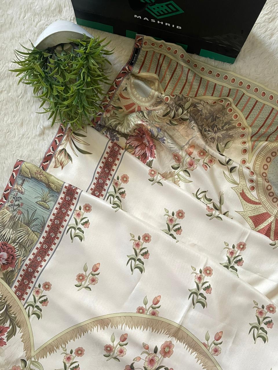A luxurious shawl printed on fine herringbone fabric, adorned with sophisticated floral and geometric designs. It offers a perfect blend of tradition and modern luxury.