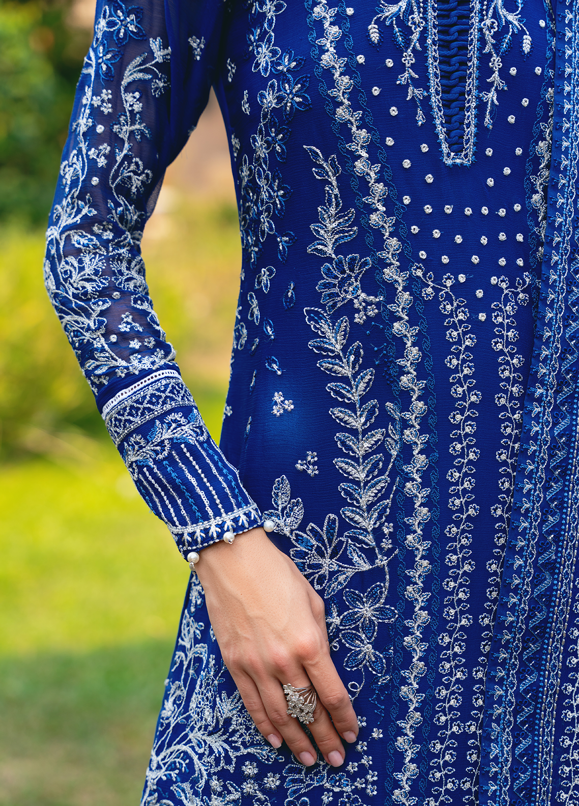 Navy blue chiffon blossoms with intricate floral patterns, adorned in shades of ivory, sapphire, electric blue, and periwinkle, heightened by iridescent accents. 'Celise' is adorned with dazzling embroideries, creating a divine composition. The diaphanous tonal dupatta boasts delicate lush embroidered borders, while the raw silk pants culminate in a meticulously detailed formal ensemble that truly stands as an enduring treasure.