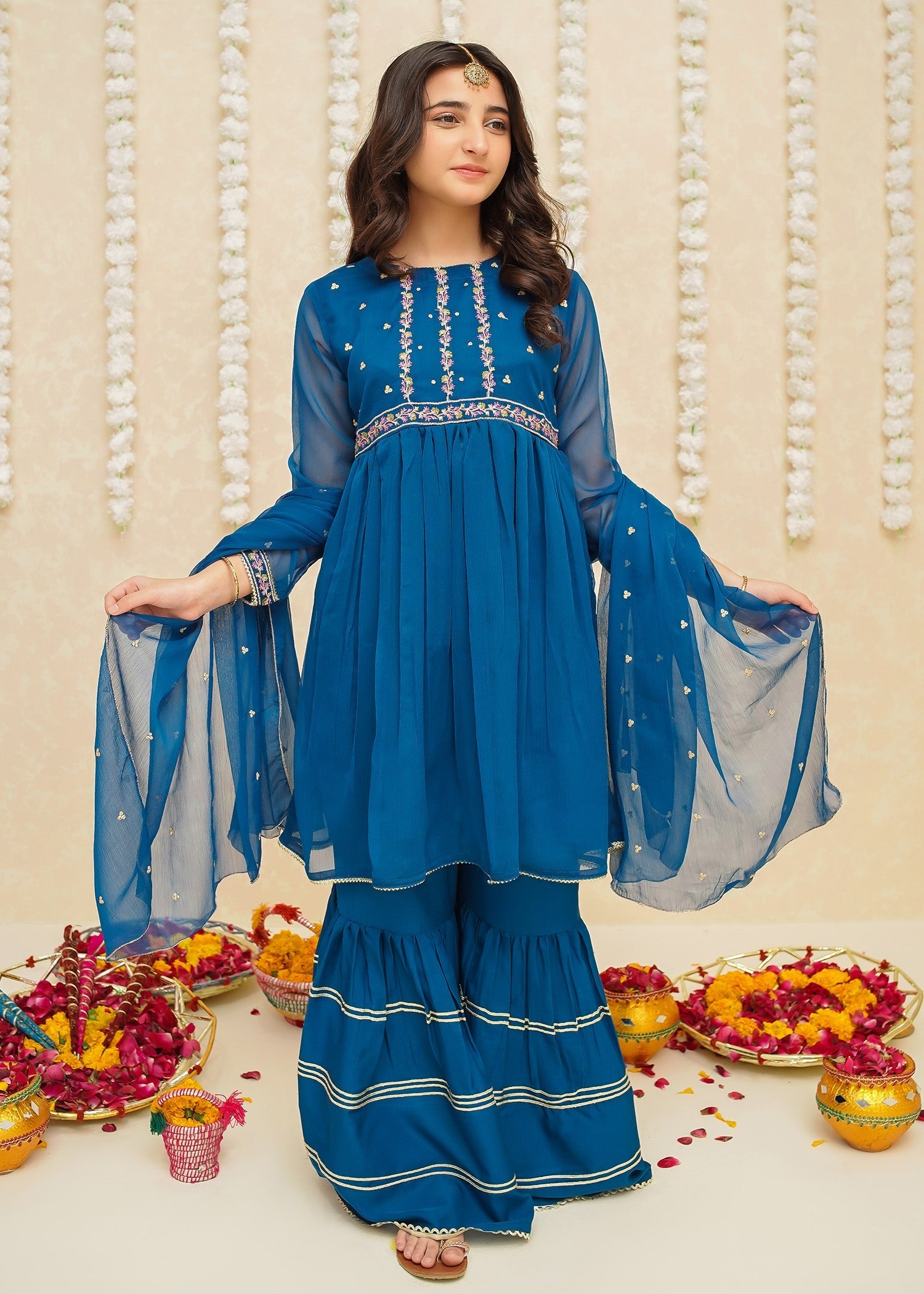 This beautiful blue peplum features embroidered neck work detailing. Paired with a gharara, it's a perfect pick for festive occasions and celebrations.