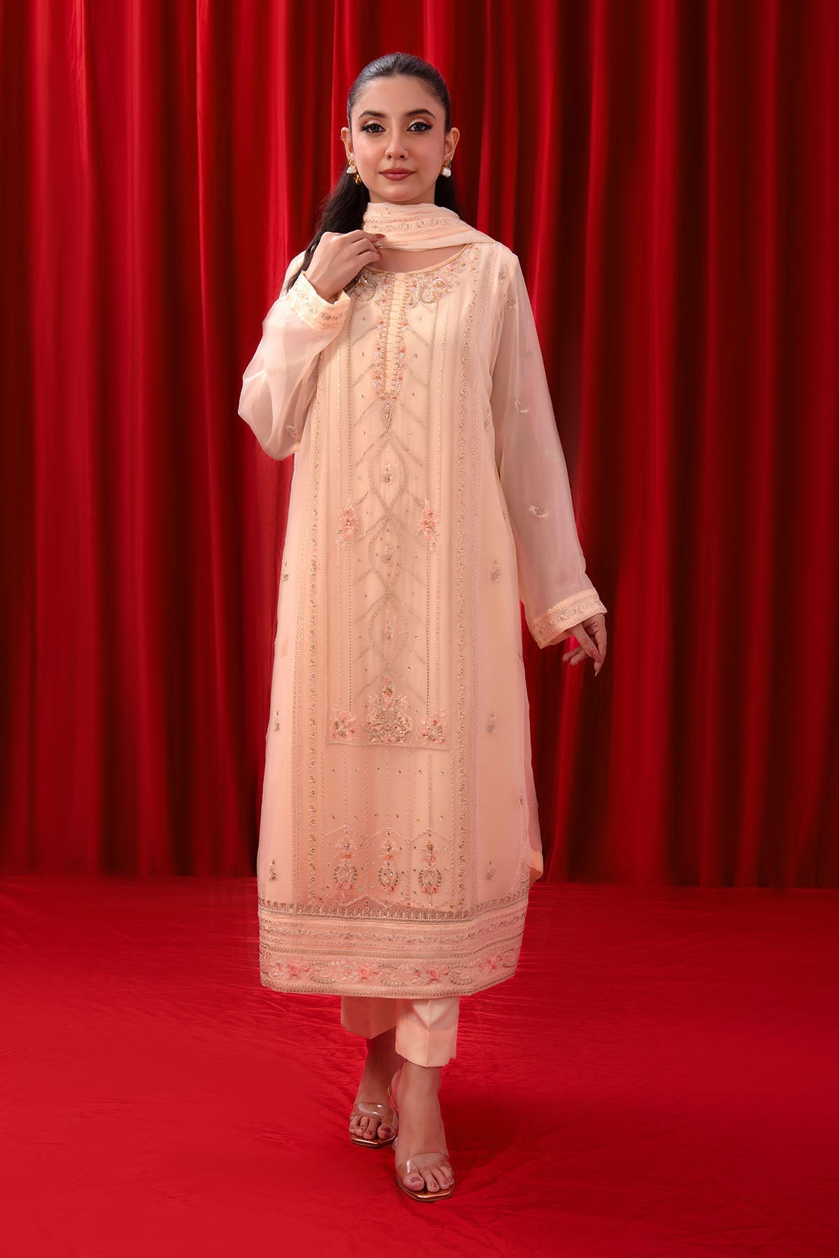 "Top: Peach Chiffon Kurta with Hand Adda Work, Sequence Embroidery and Malai Crepe Inner