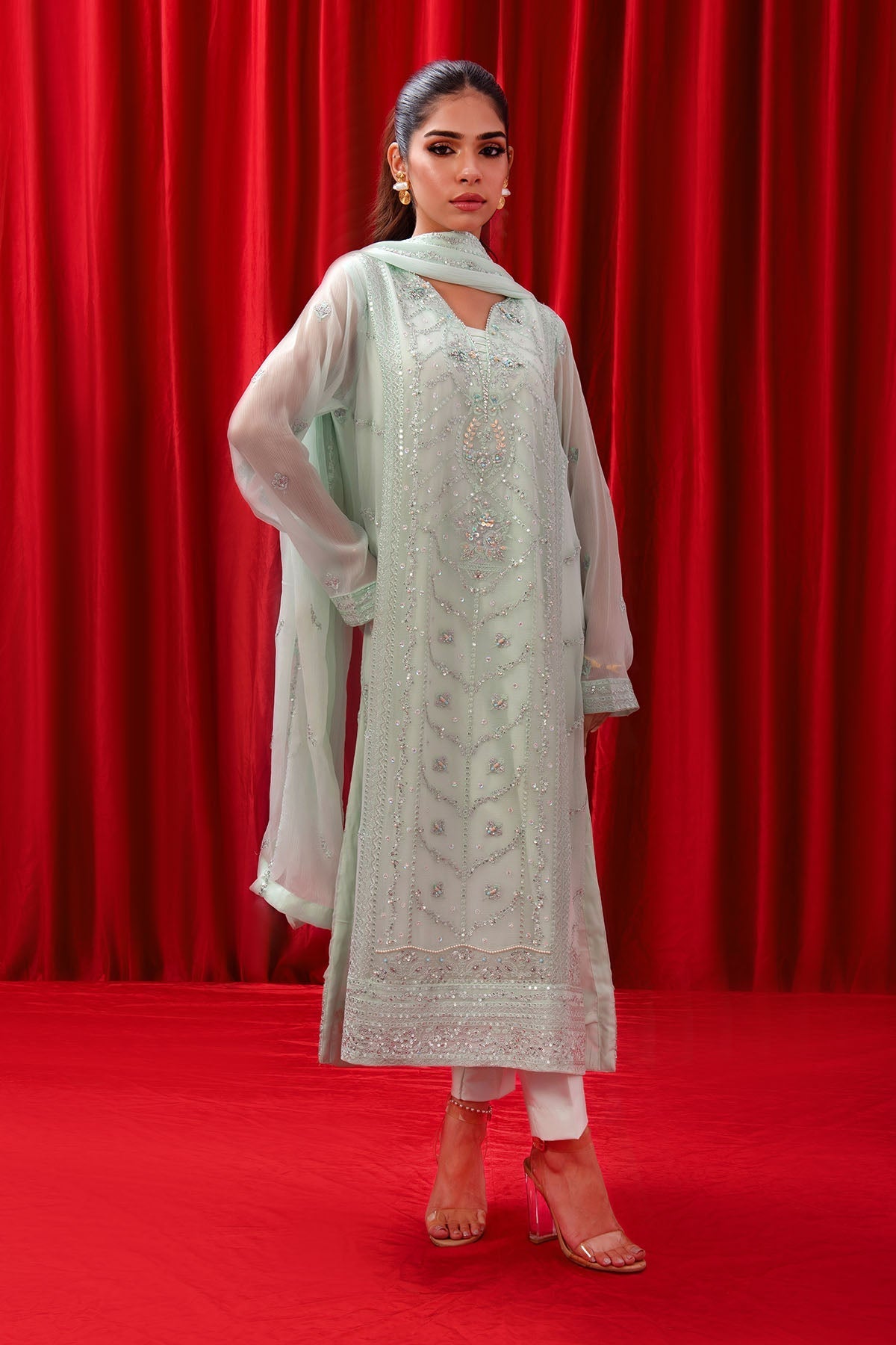 Dupatta: Mint Chiffon Dupatta with Embroidery"