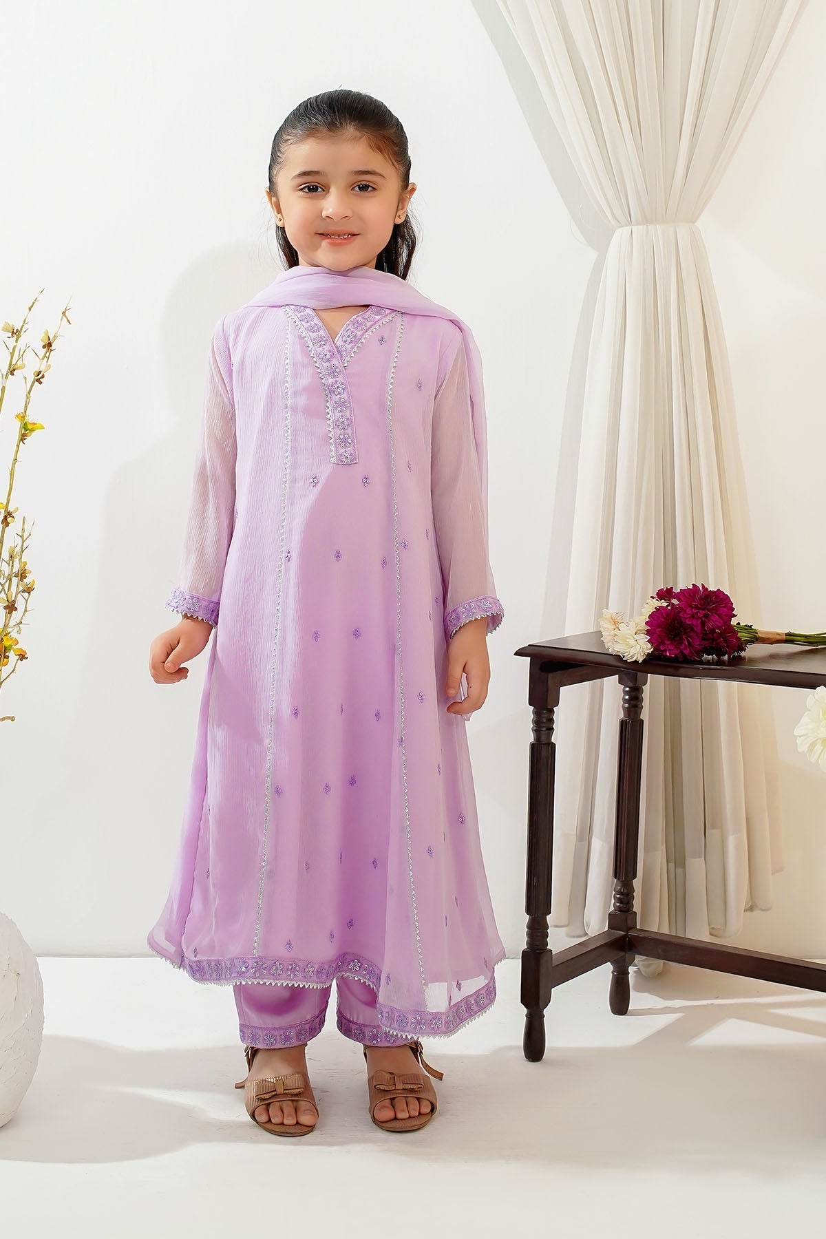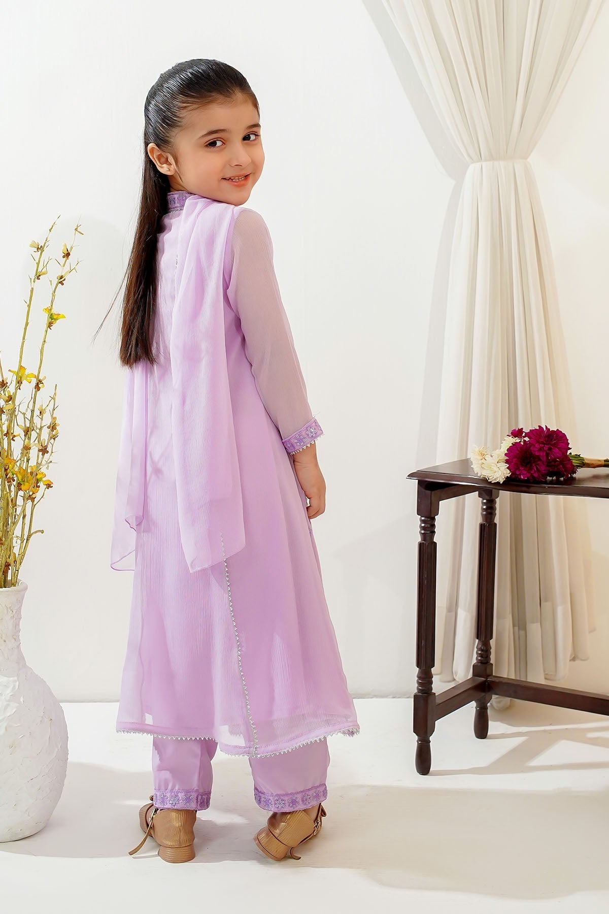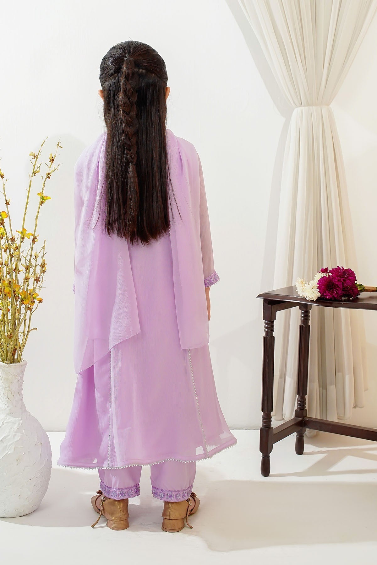 Top: Lavender Chiffon Flared Kurta with Embroidery, Gota Lace Work and Malai Crepe Lining Stitched