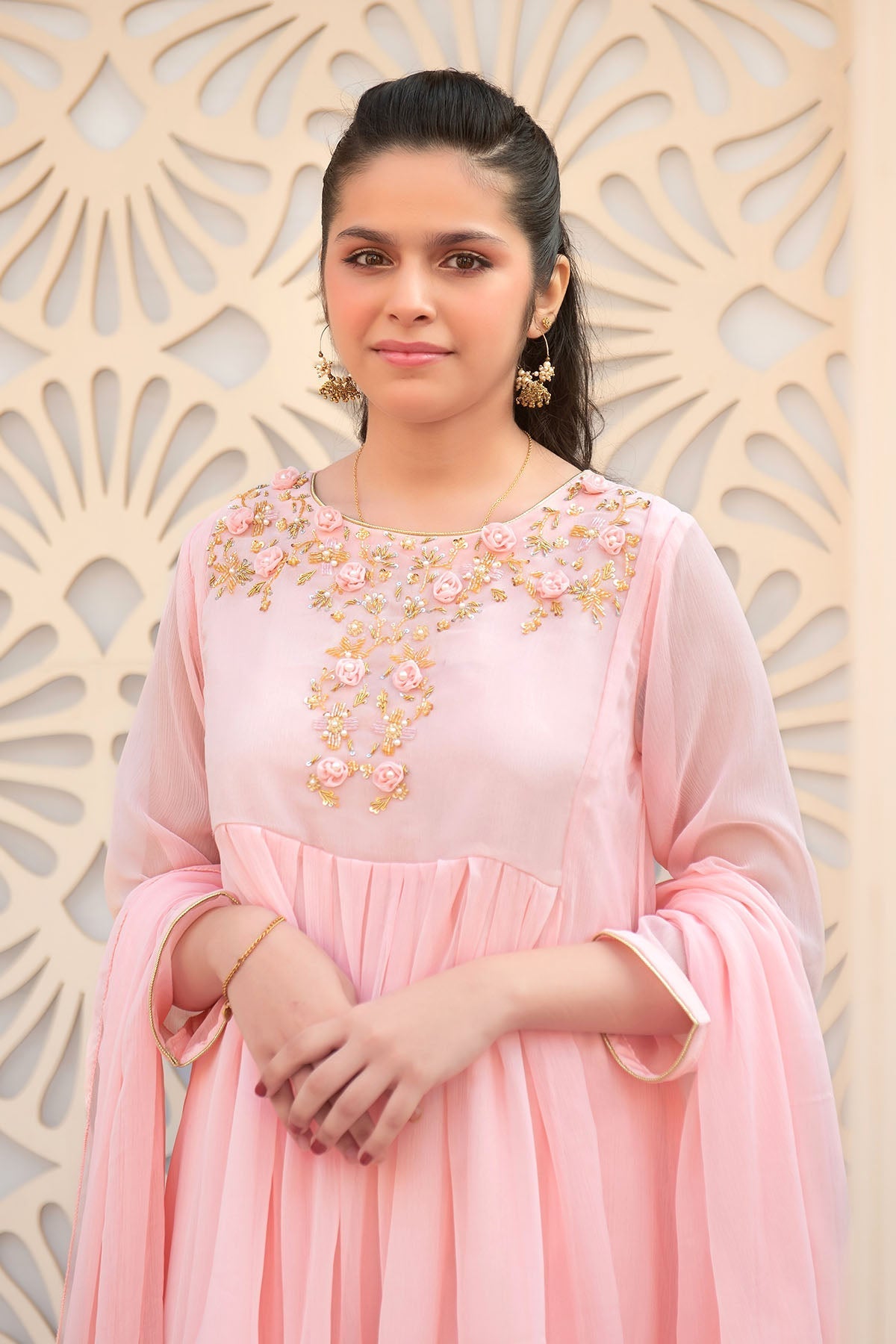 Top: Peach Chiffon Round Neck Frock Style Kurta And Hand Adda Work Around Neck-Line With Stitched Malai Crepe Lining Attached
