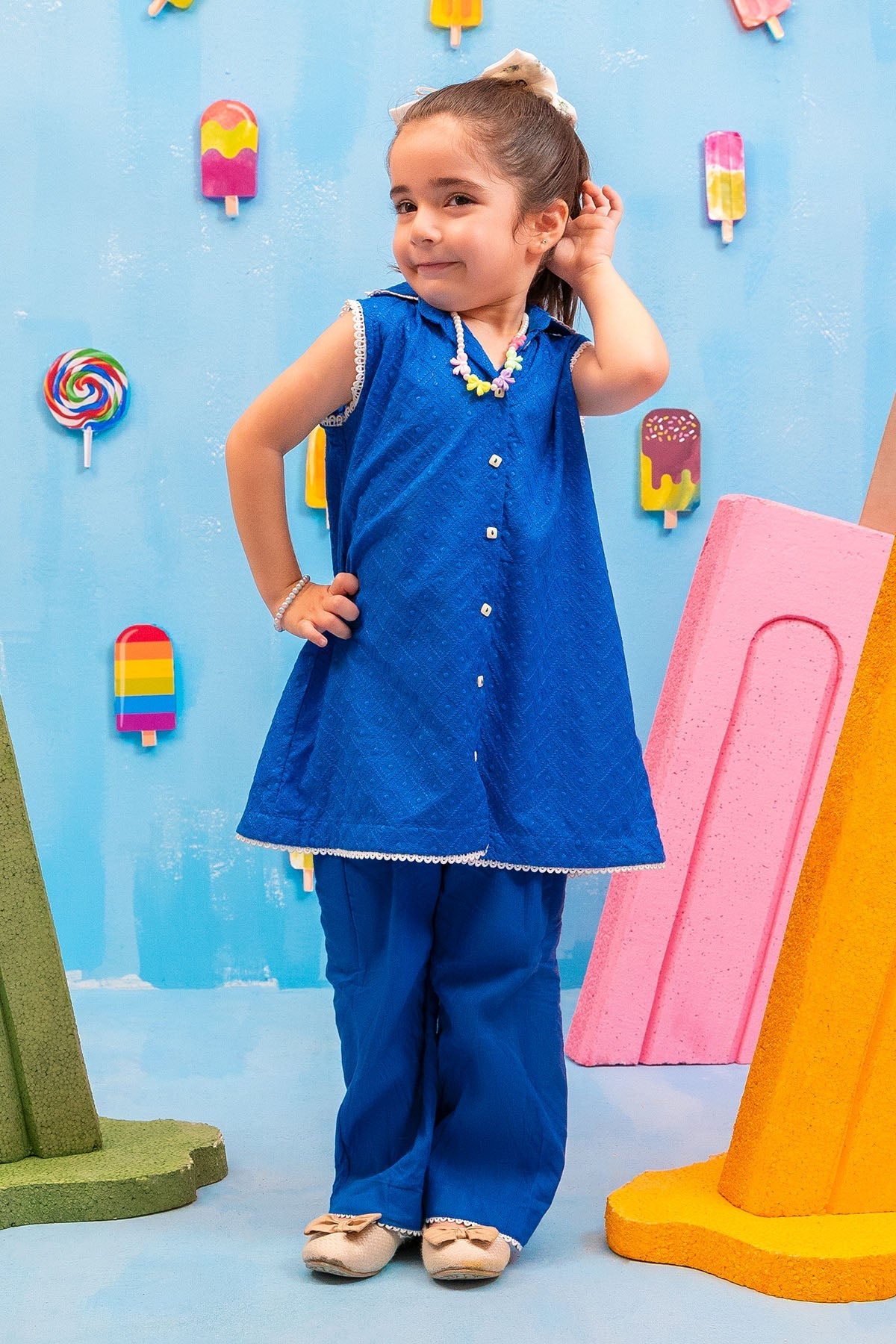 Top: Blue Chikankari Top With LacesBottom: Blue Cotton Trouser