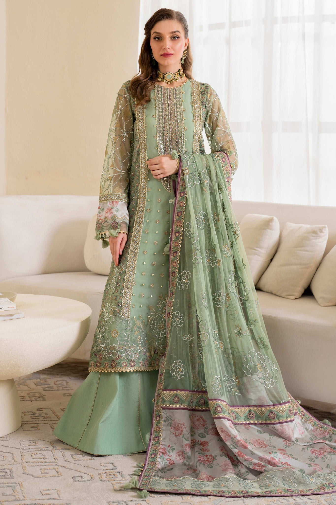 Shirt Center Panel: Embroidered Net With Foil Work Shirt Side Panel: Embroidered Net Shirt Back: Embroidered Net Neckline: Embroidered Organza(1...