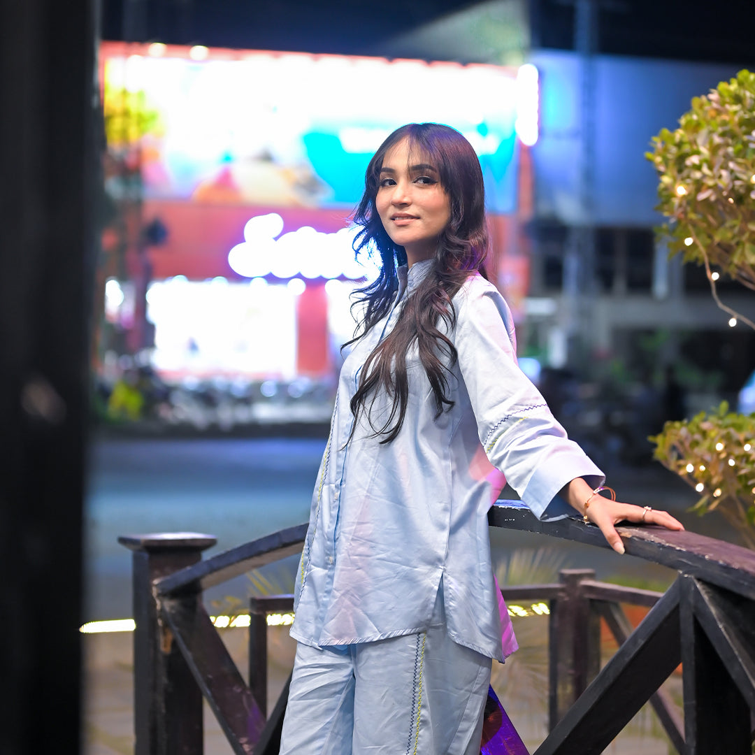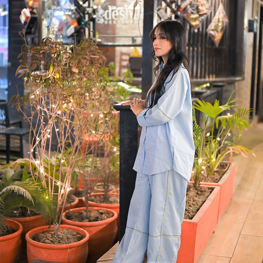 | Stand out in style with this Sea Blue Satin embellished co-ord set. The shirt is adorned with subtle hand made zig zag embroidred embellishments that enhance the rich texture of the satin fabric, while the bottom trousers with additional zig zag embroidery mots add a chic, contemporary flair. Perfectly designed for elegance and comfort, this set brings bold sophistication to any occasion. |