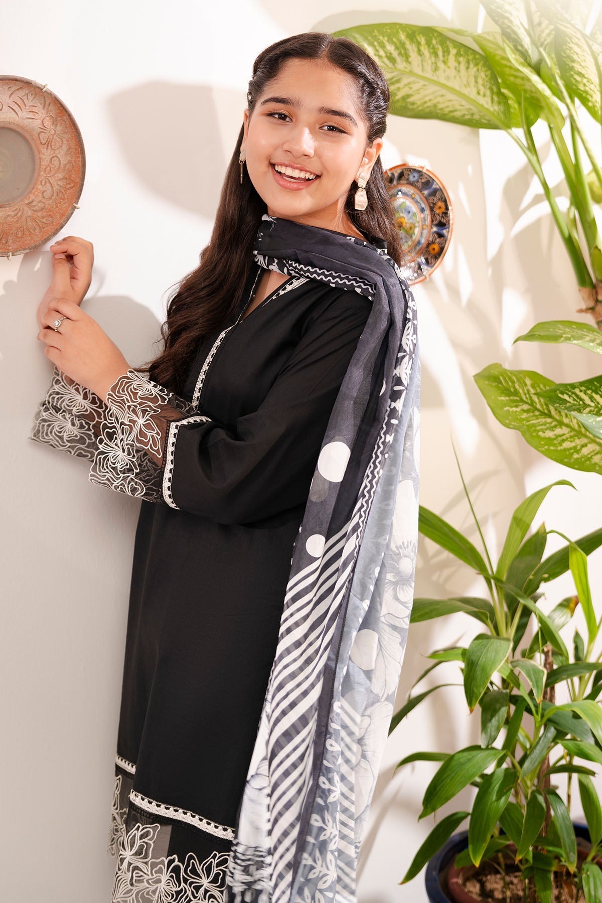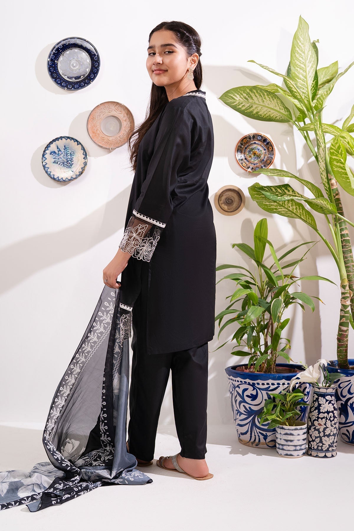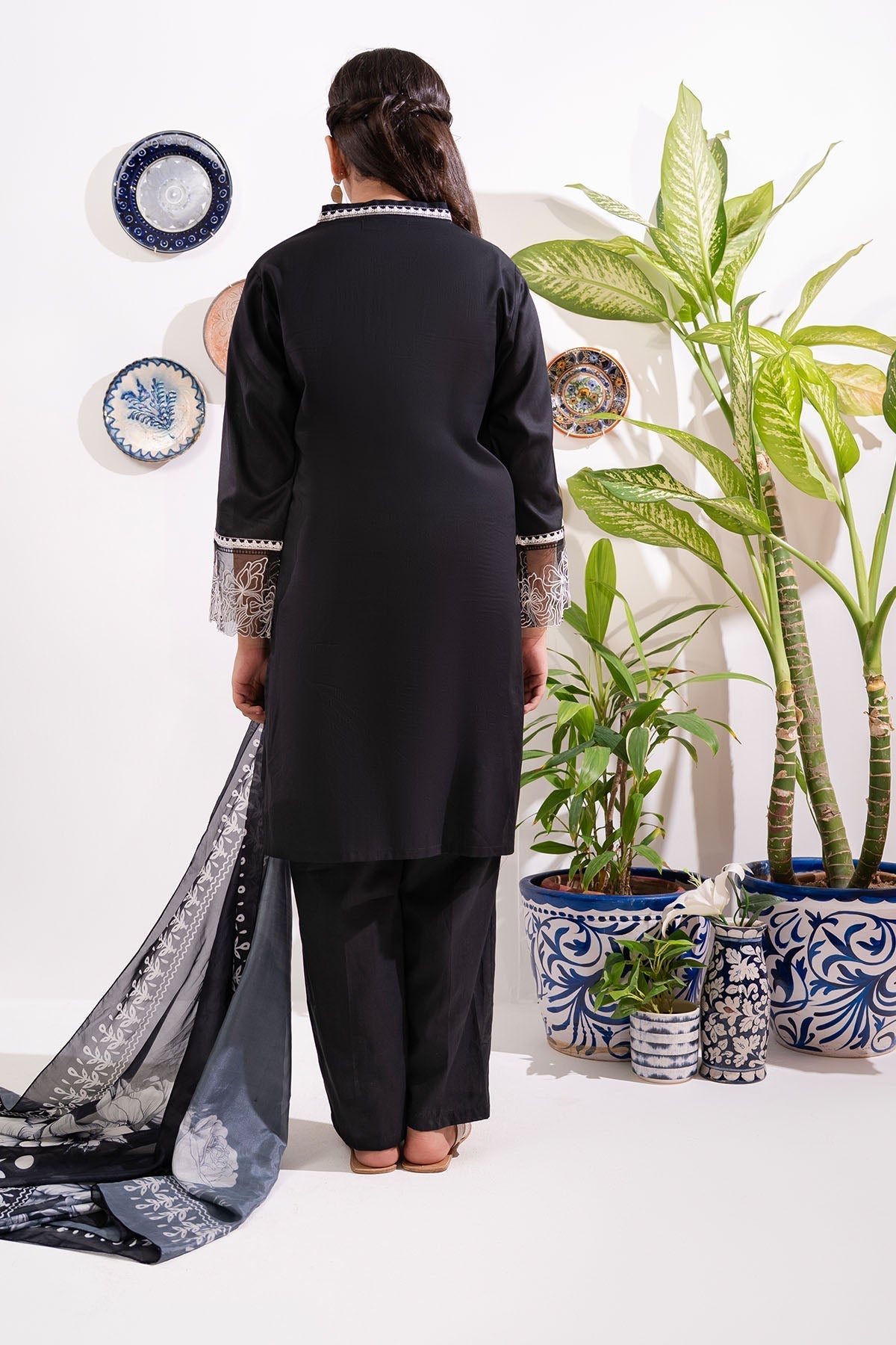 Top: Black Cotton Kurta With EmbroideryBottom: Black Cotton Trouser Dupatta: Black Digital Printed Silk Dupatta