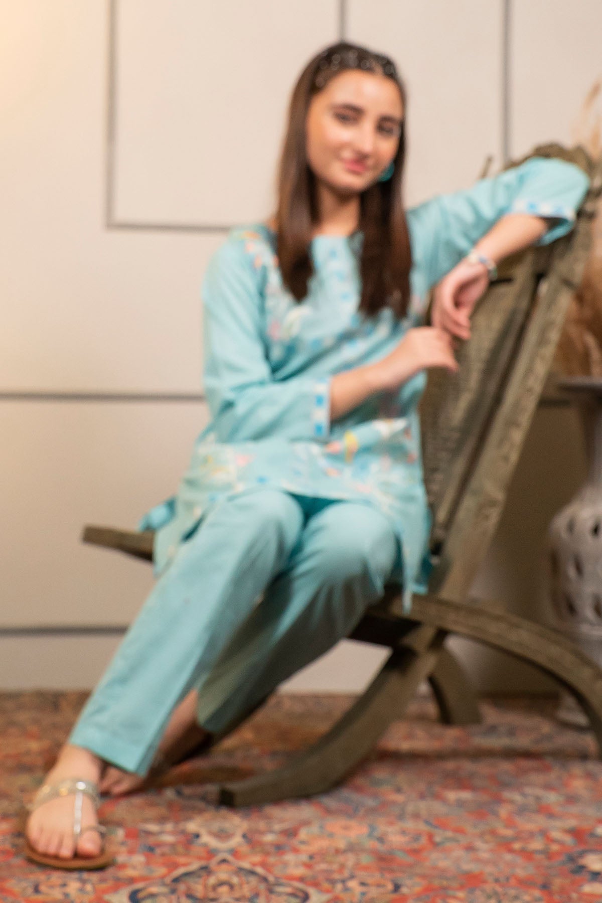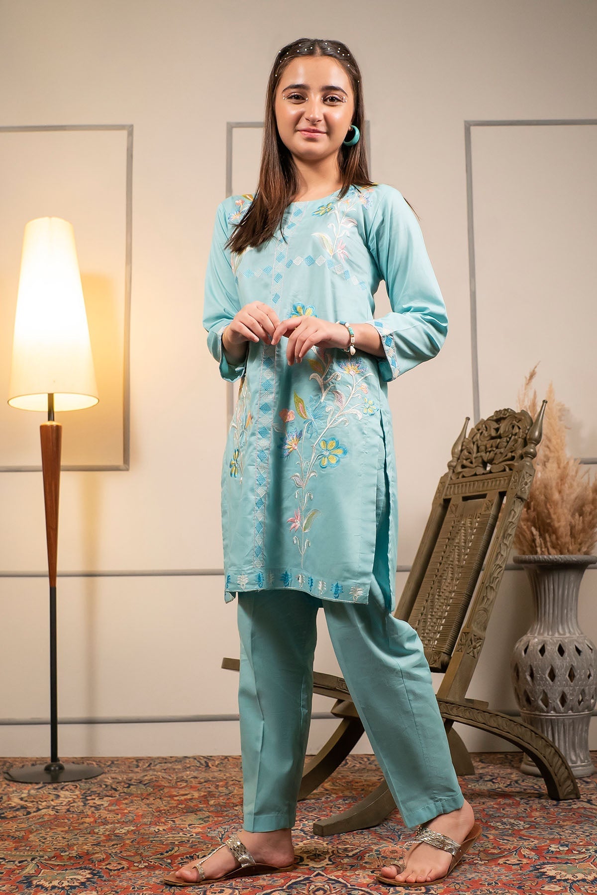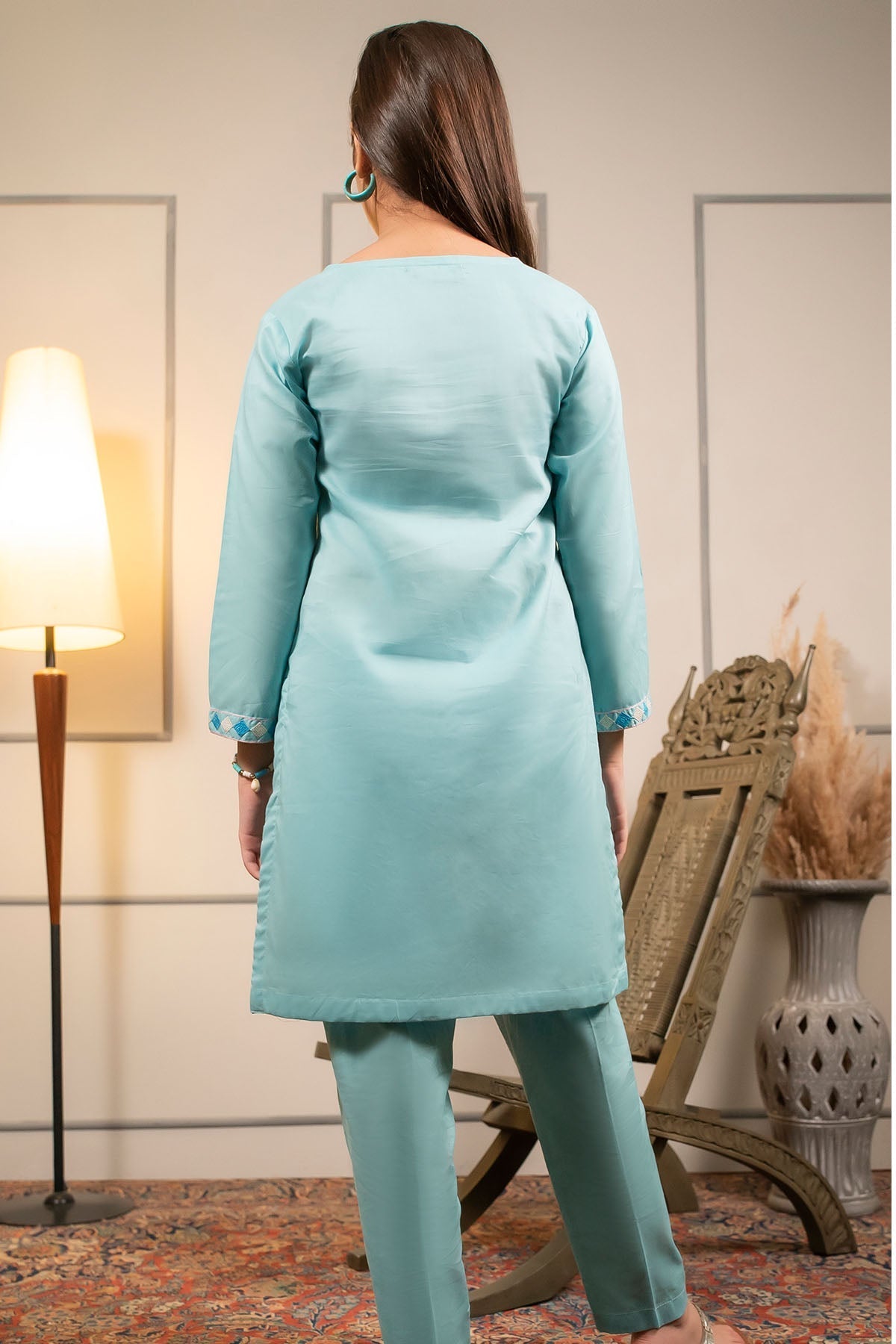 Top: Blue Cotton Kurta with EmbroideryBottom: Blue Cotton Trouser