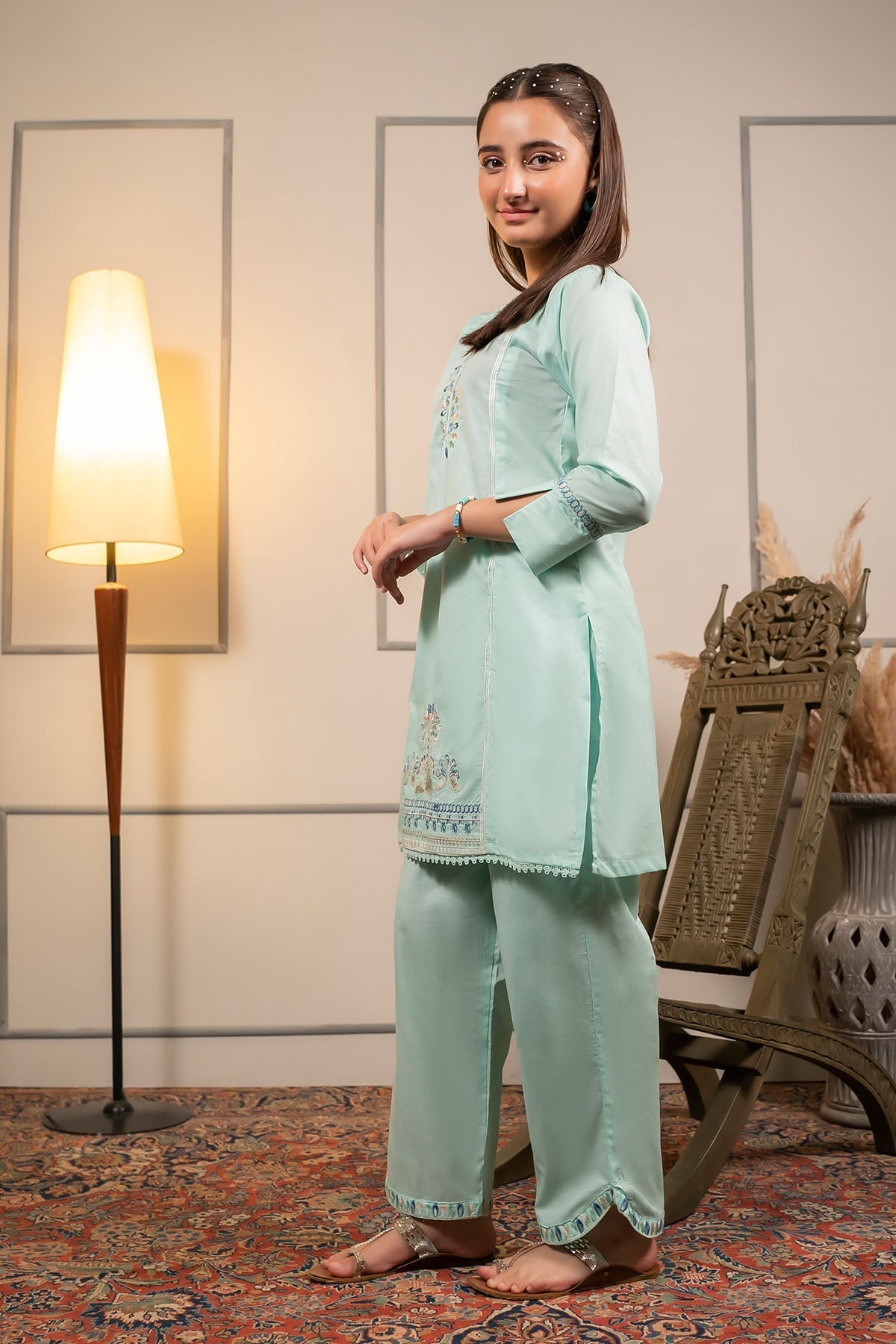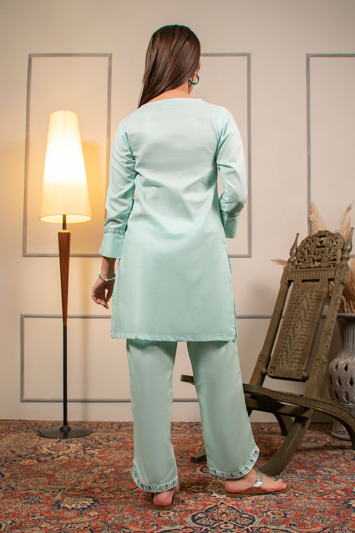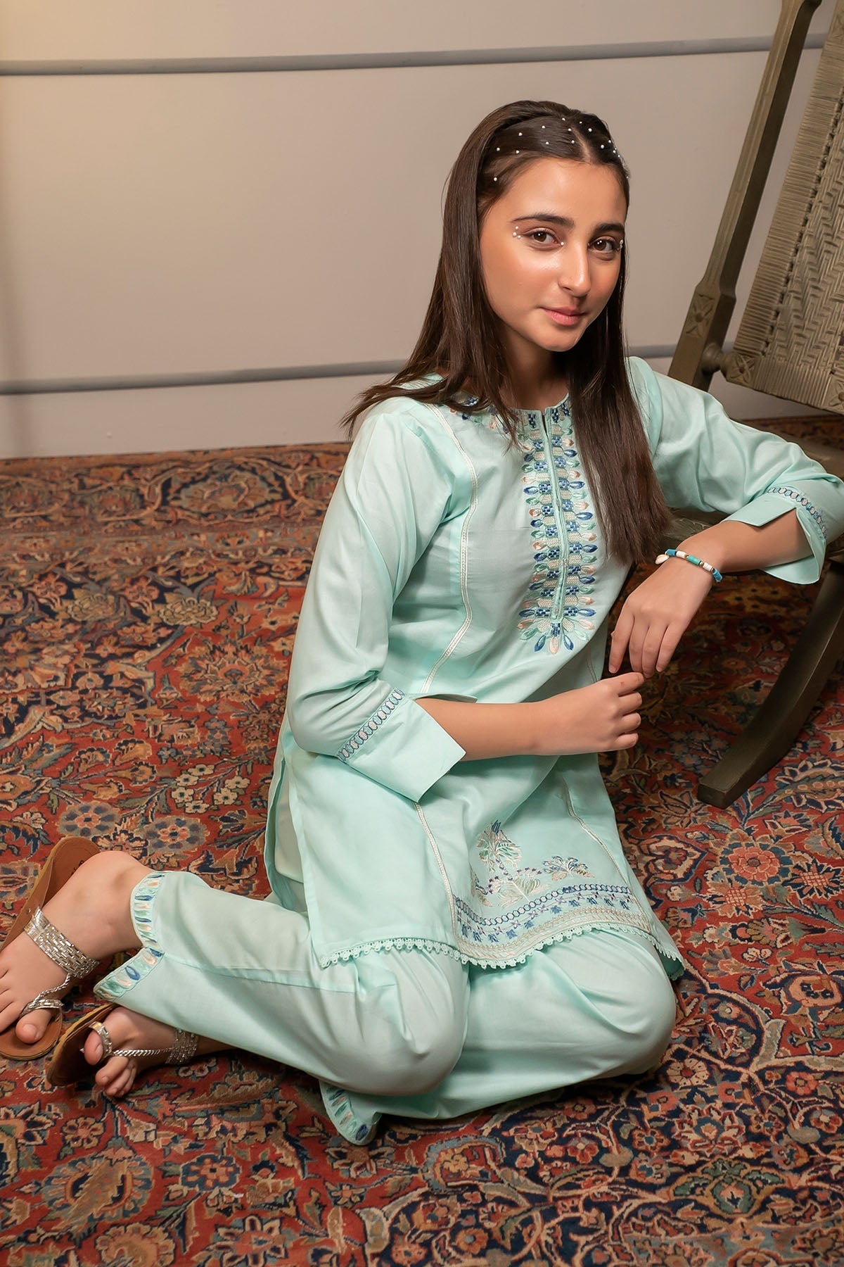 Top: Ice Blue Cotton Kurta with EmbroideryBottom: Ice Blue Cotton Trouser with Embroidery