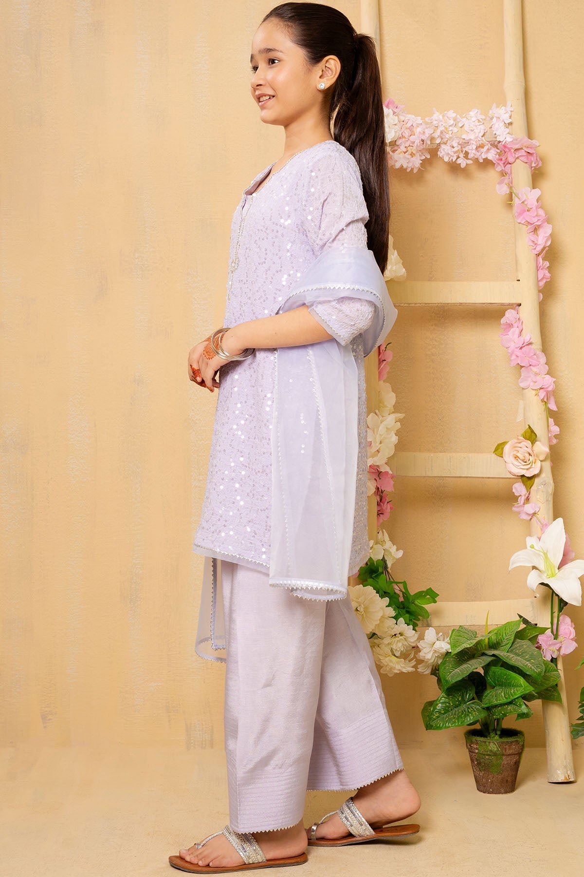 Top: Lavender Sequence Embroidered Net Kurta With Adda Work and Malai Crepe Lining