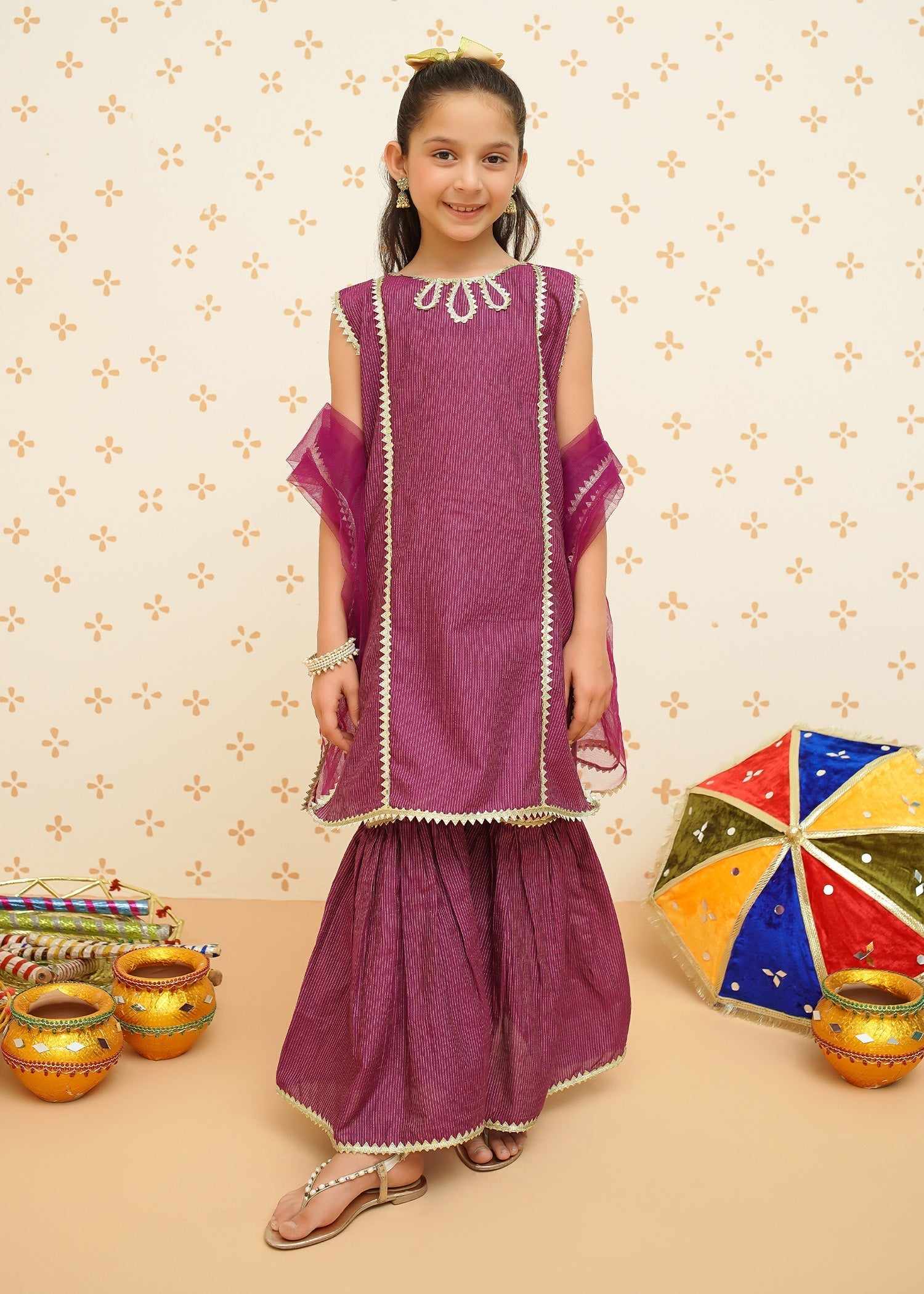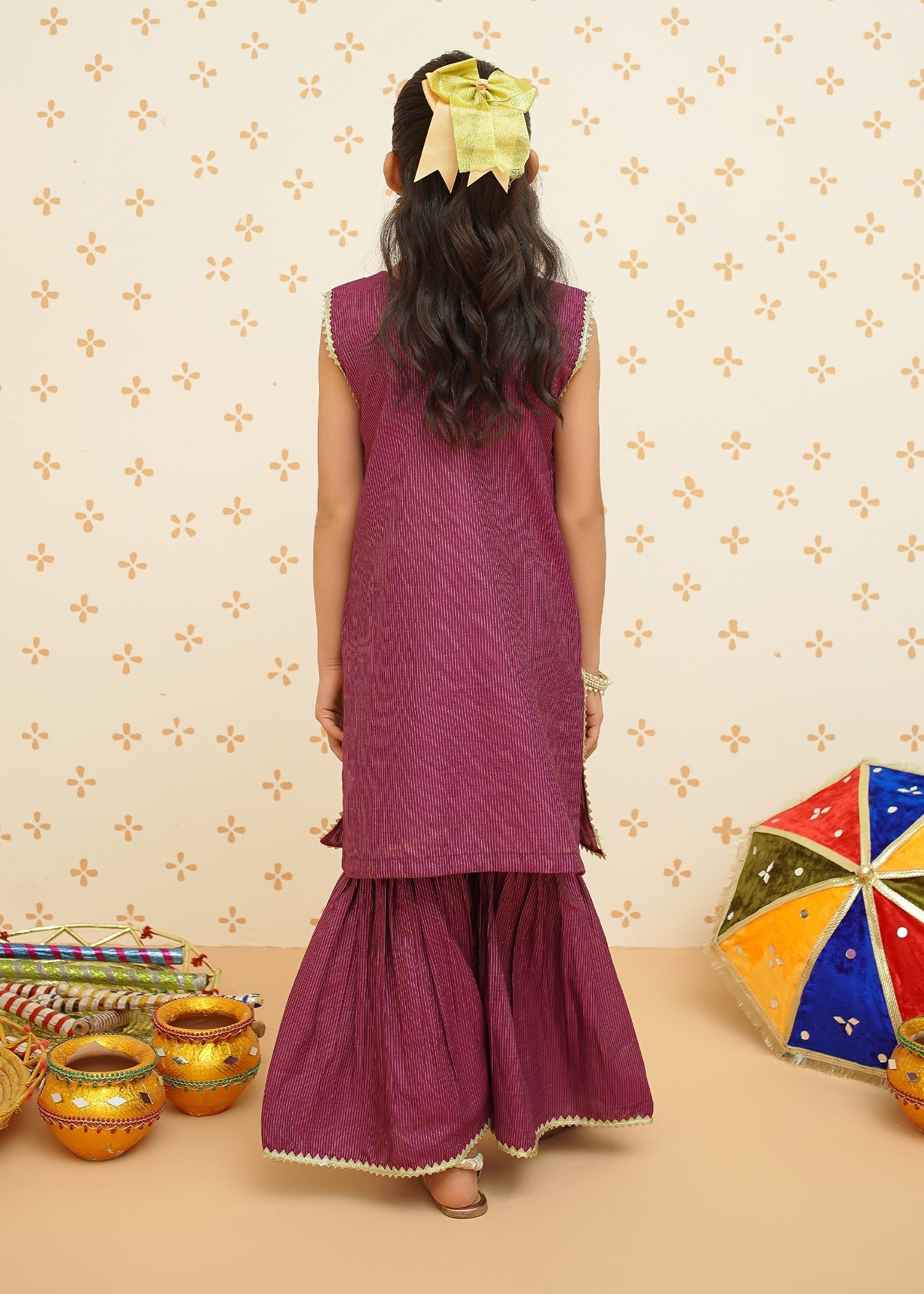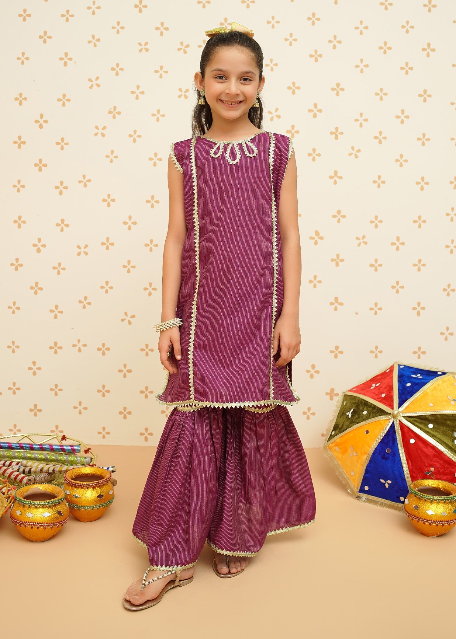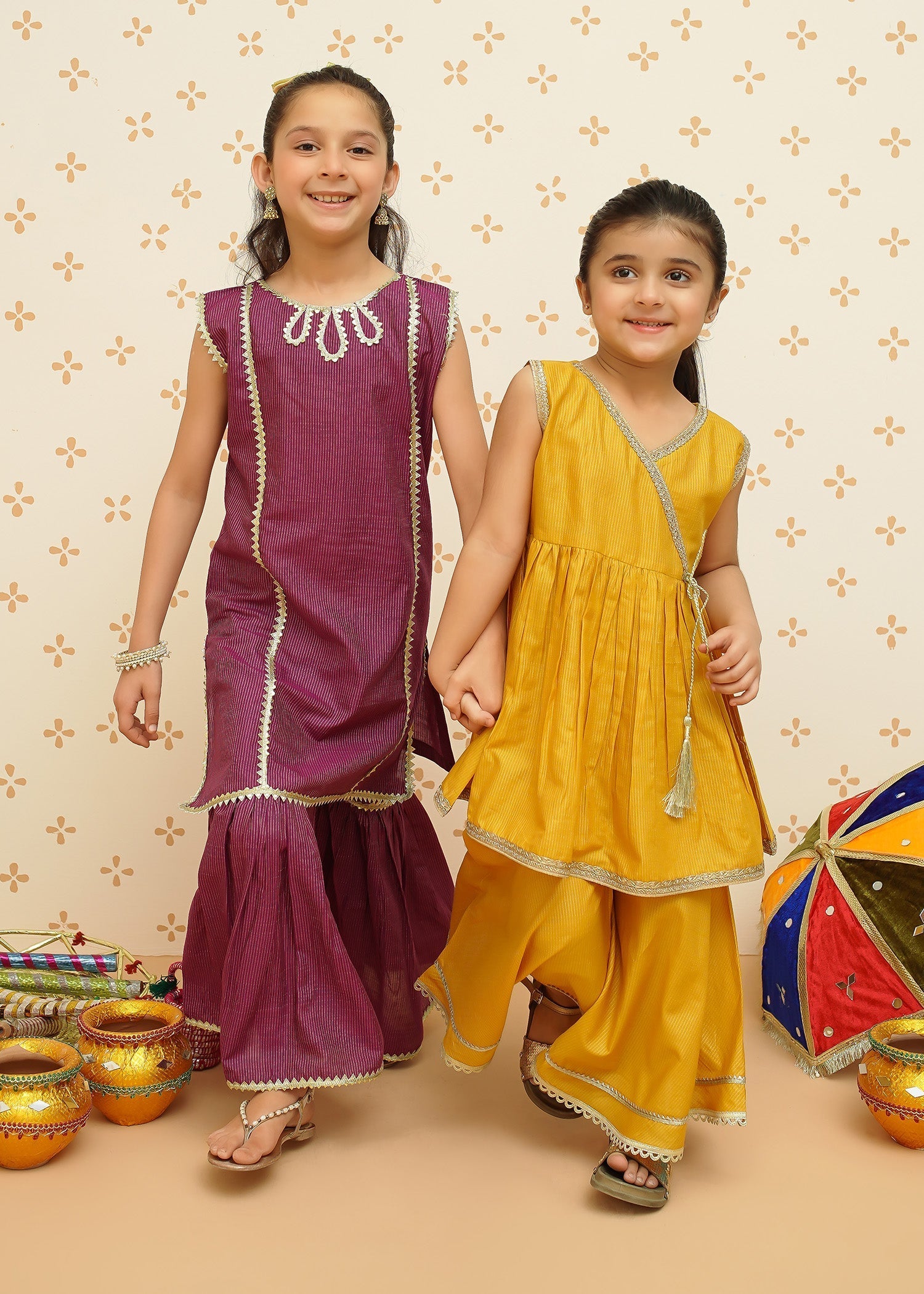Detailing: The set features a sleeveless straight-cut shirt adorned with delicate gota lace detailing,?paired with a flowy gharara for a classic yet modern touch. A lightweight net dupatta completes the ensemble, making it a perfect pick for festive celebrations. Perfect for Eid, weddings, and cultural celebrations!?