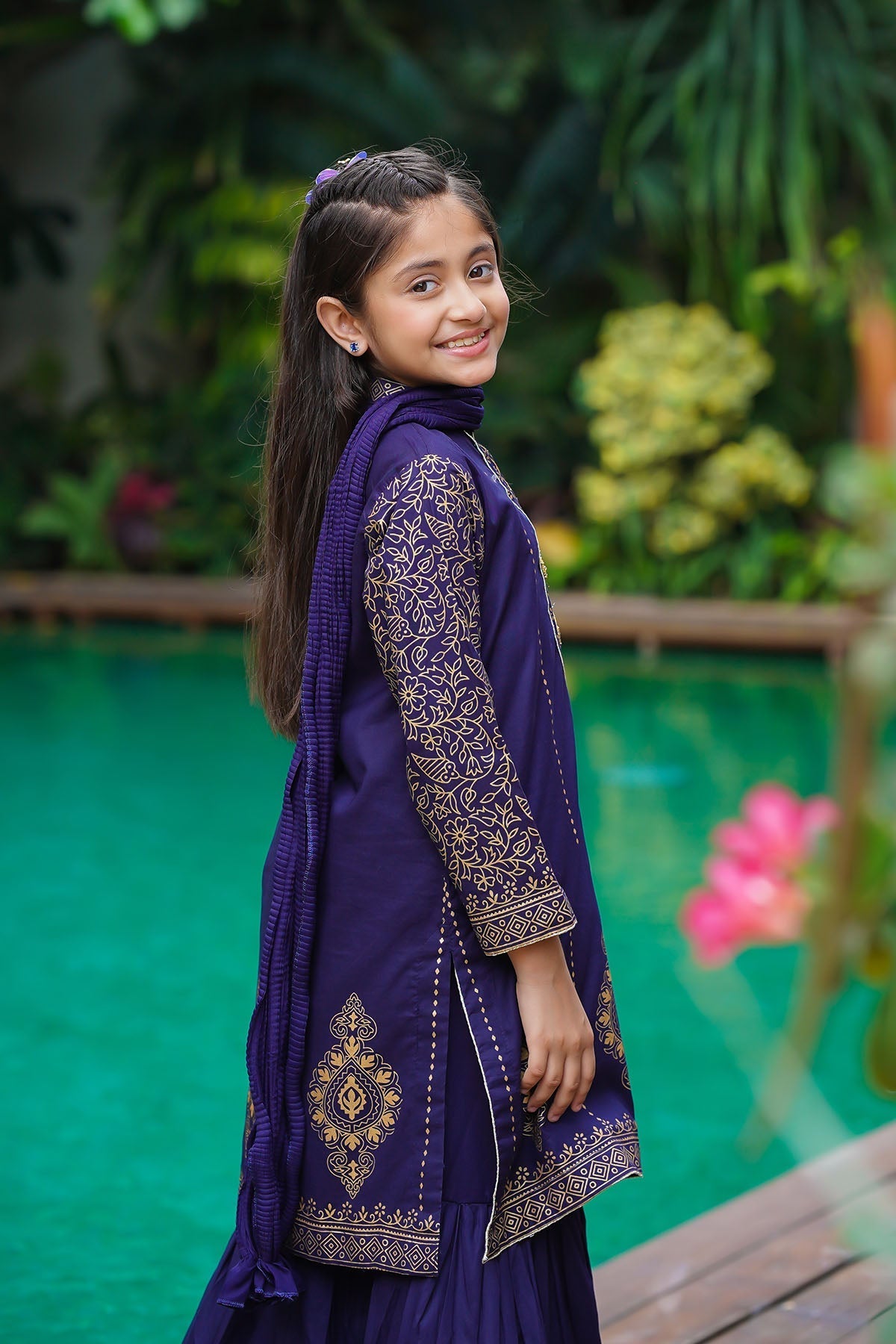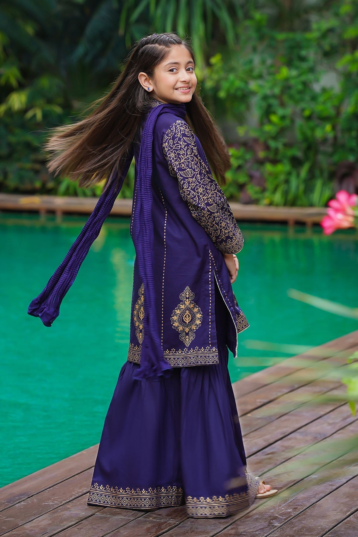 Top: Navy Blue Cotton Kurta With Screen Print Bottom: Navy Blue Cotton Gharara Pants With Screen Print BorderDupatta: Navy Blue Malai Crepe Crush Dupatta
