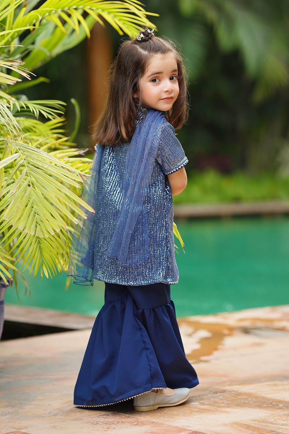 Top: Navy Blue Sequence Net Koti With Malai Crepe InnerĀ Bottom: Navy Blue Malai Crepe Gharara Pants