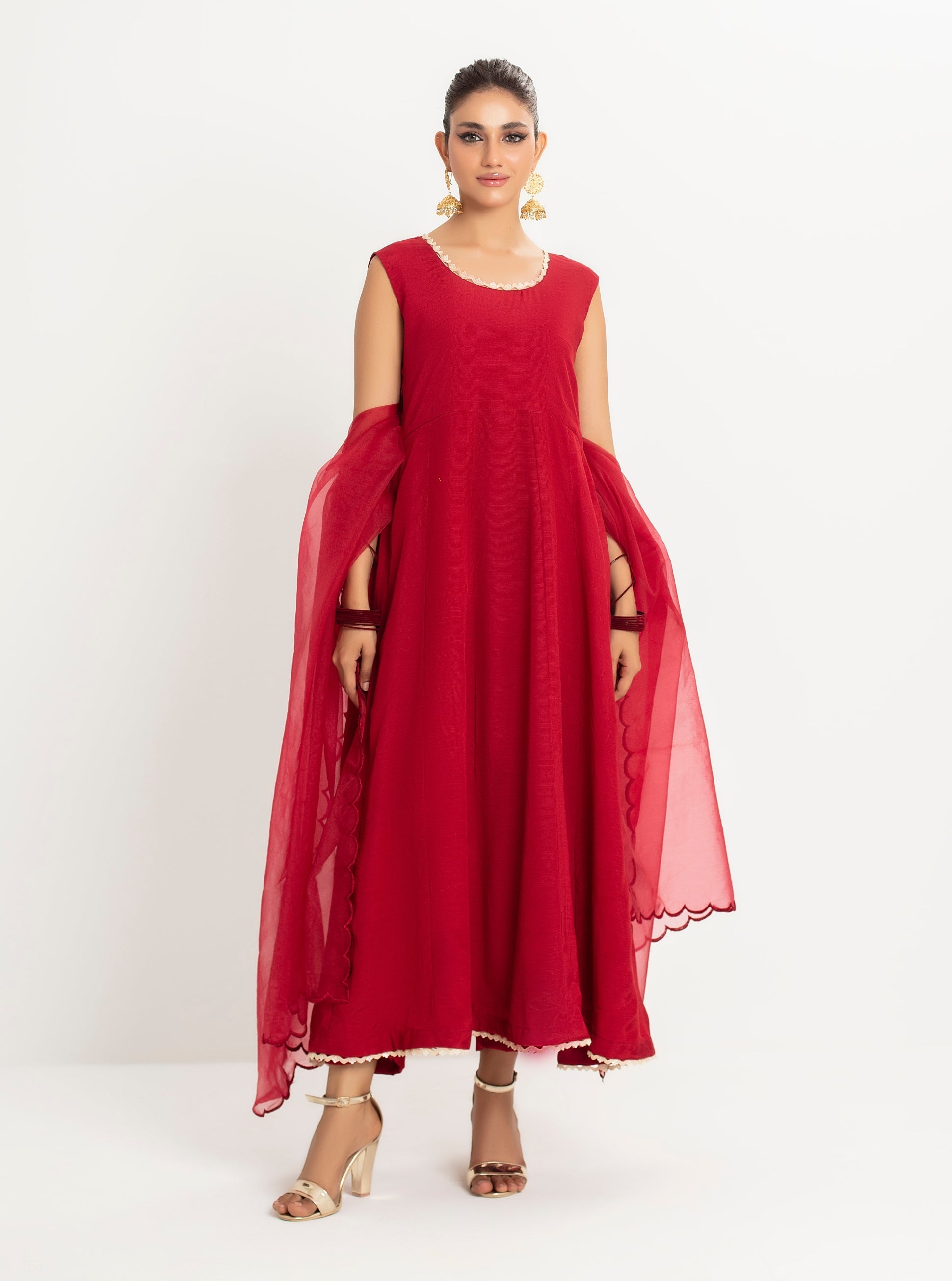Introducing "Carimson" designed to steal the spotlight. This stunning panelled frock-style dress, crafted from luxurious maroon silk fabric, features a sleeveless design perfectly paired with matching bottom, adding a modern twist. Adorned with delicate sequins lace on the neckline, front, and back, along with a fancy tassel at the back, it embodies youthful charm and a touch of glamour.